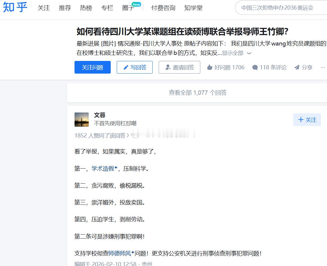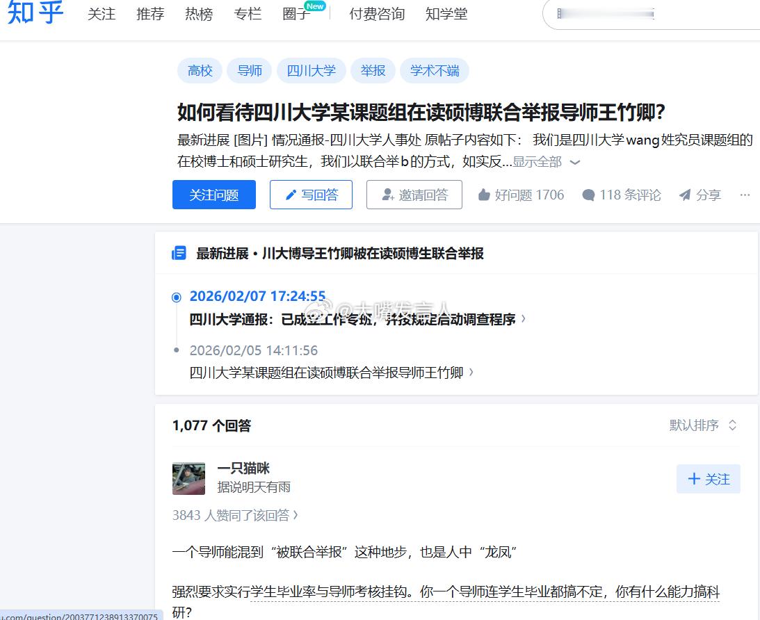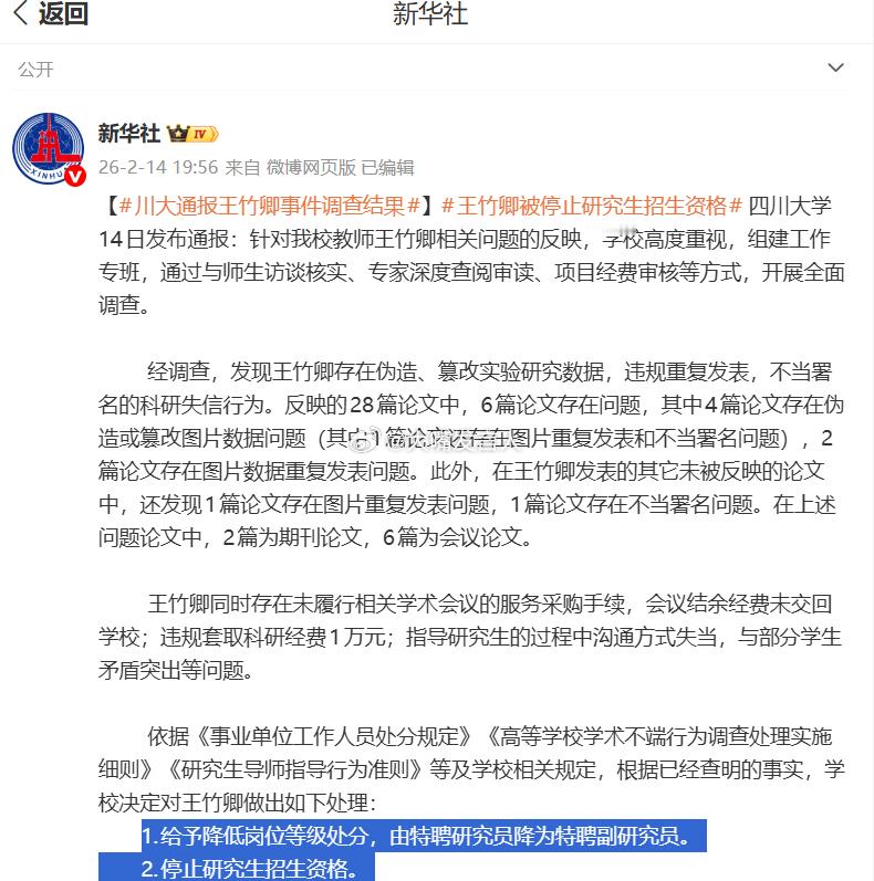 川大通报王竹卿事件调查结果 感觉处分得并不重:1.给予降低岗位等级处分,由特聘研究员降为特聘副研究员。 2.停止研究生招生资格。 3.取消财政性资金支持科技项目等的申请资格5年;对涉及科研失信行为的科研论文、项目等报送有关部门。