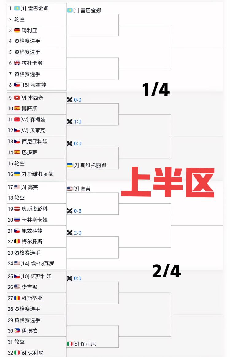 WTA1000迪拜站签表出炉!! 郑钦文在下半区,跟亚力娃和佩姐在3/4区,下半区小米辣和阿尼西莫娃在4/4区,卫冕冠军小米辣还跟姆博科在一个1/8区,哈哈,小米辣估计要哭晕在厕所了。上半区莱巴金娜跟斯维托丽娜1/4区,高芙和保利区在2/4区。 郑钦文的对手是资格赛选手,目前资格赛还没有打完,静等!!郑钦文赛程安排