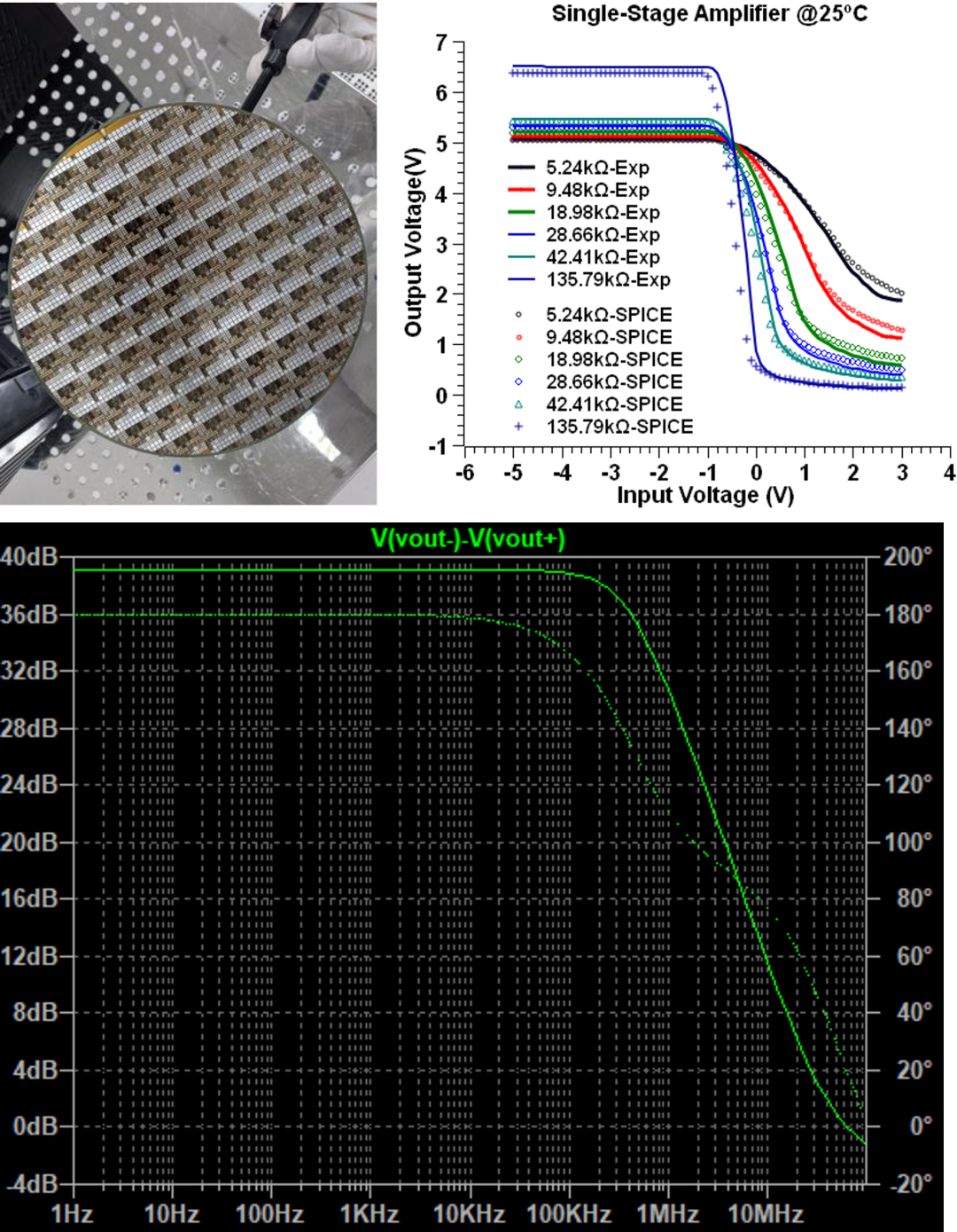 该SiCJFETIC平台基于深圳平湖实验室先进的8英寸SiC中试平台开发,同时兼容SiC功率JFET与JFET集成电路(IC)技术工艺,可以满足不同电阻规格的JFET与JFETIC技术开发需求。基于平台器件电性测试结果提取SPICE模型,可以较好拟合单级放大器电性测试结果(图二右)。设计差分放大器结构进一步优化后,基于SPICE模型仿真,在-5.90V的共模电压下,可实现39.1dB差分电压增益和407kHz的-3dB带宽,以及极高输入阻抗。