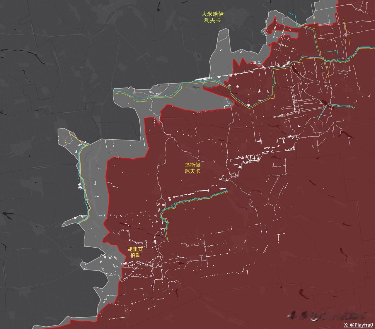 扎波罗热州胡里艾伯勒—第聂伯罗彼得罗夫斯克州大米哈伊利夫卡方向的防御工事全景图(此前,该方向的防御工事由乌军修筑,其中绝大部分已被俄军控制)。 白色标注的是战壕。 黄色标注的是反坦克壕沟。 蓝色标注的是“龙牙”防线。 灰色标注的是铁丝网防线。 该区域的防御工事规模宏大、密集程度极高。从工程量上可以看出,这里的防御体系是系统性的,旨在长期坚守阵地。