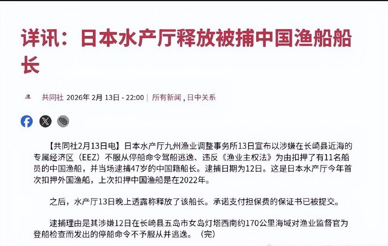 “赶紧放了!”高市这次比菅义伟还急!下面办事的人太不“长眼”! 日本为啥24小时就放了中国渔民? 2010年9月7日那次,中方要求立刻释放中国船长,但日本说要走司法程序无法立刻放人, 中国警告要报复,事态越拖越严重。 日本外相前原诚司回忆,自己和外务次官佐佐江贤一郎到首相官邸问怎么办时, 菅直人用相当强烈的口吻说:给我立刻放人。 这次高市估计比菅义伟还要急,为啥? 因为如果媒体一炒作日本民意闹起来,高市早苗就放也不是不放也不是。 但不放人的后果她又没办法预测。 日本共同社消息,2月13日日本水产厅宣布,在提交支付保证金的书面担保后, 中国船长已被释放。 从被抓捕到释放,不到24小时就解决了。 只能说日本下面办事的人也是太不“长眼”!