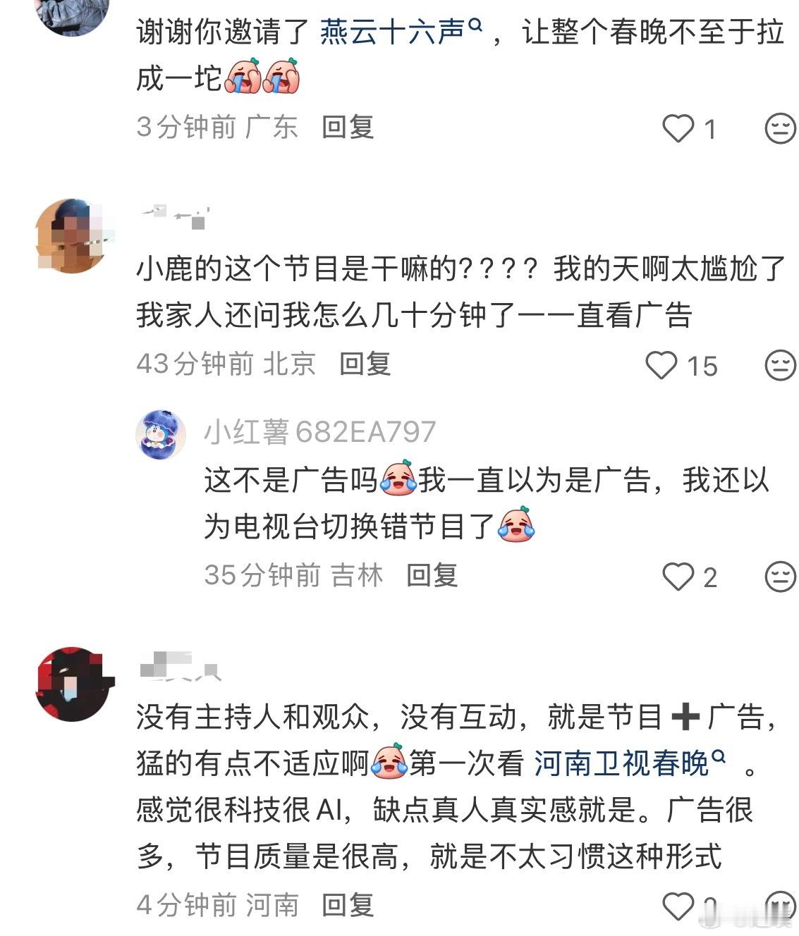网友:河南卫视每隔0.1秒插入一个广告,已经分不清哪个是节目哪个是广告了河南春晚