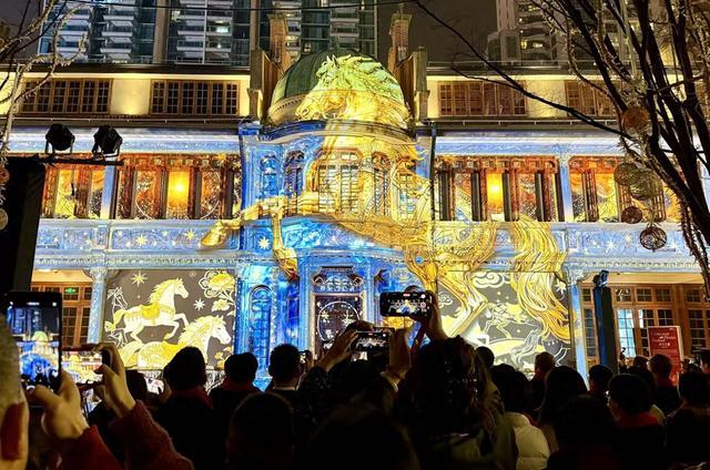 活动期间,市民游客漫步至茂名北路,可以在《天河奔马》镭射流苏光影装置下感受“福禄寿禧财”五福光影随昼夜流转的吉祥意趣,在《新岁》光影装置钻石般的光芒下定格新春瞬间。驻足张园,还能看到徐悲鸿笔下的骏马在《一马当先》光影秀中穿越多重奇幻时空,观赏《光影头马》光影秀以光为笔勾勒出的奔马成长画卷……
