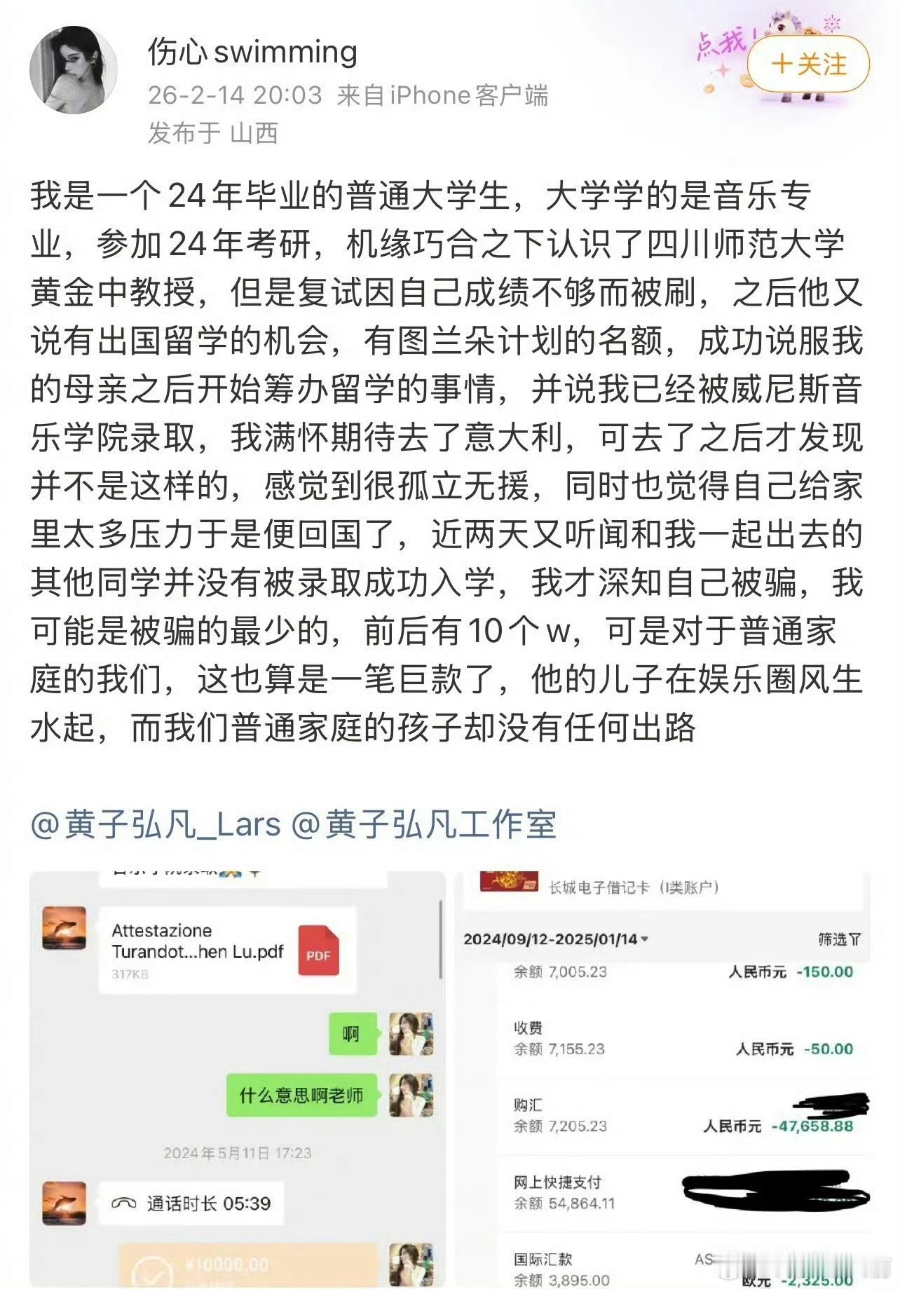 有网友爆料黄子弘凡爸爸诈骗学生,但目前还没拿出啥有力的证据,等一个后续
