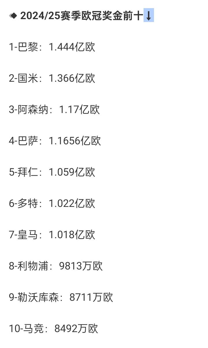 上赛季欧冠奖金分布出炉:巴黎超1.4亿,国米阿森纳巴萨拜仁多特皇马7队均破亿 02月14日 上赛季欧冠各队分发奖金出炉:冠军巴黎1.444亿欧居首,国米1.366亿欧第二、阿森纳1.17亿欧第三、巴萨1.1656亿欧第四,拜仁1.059亿欧第五,多特1.022亿欧 第六,皇马1.018亿欧第七