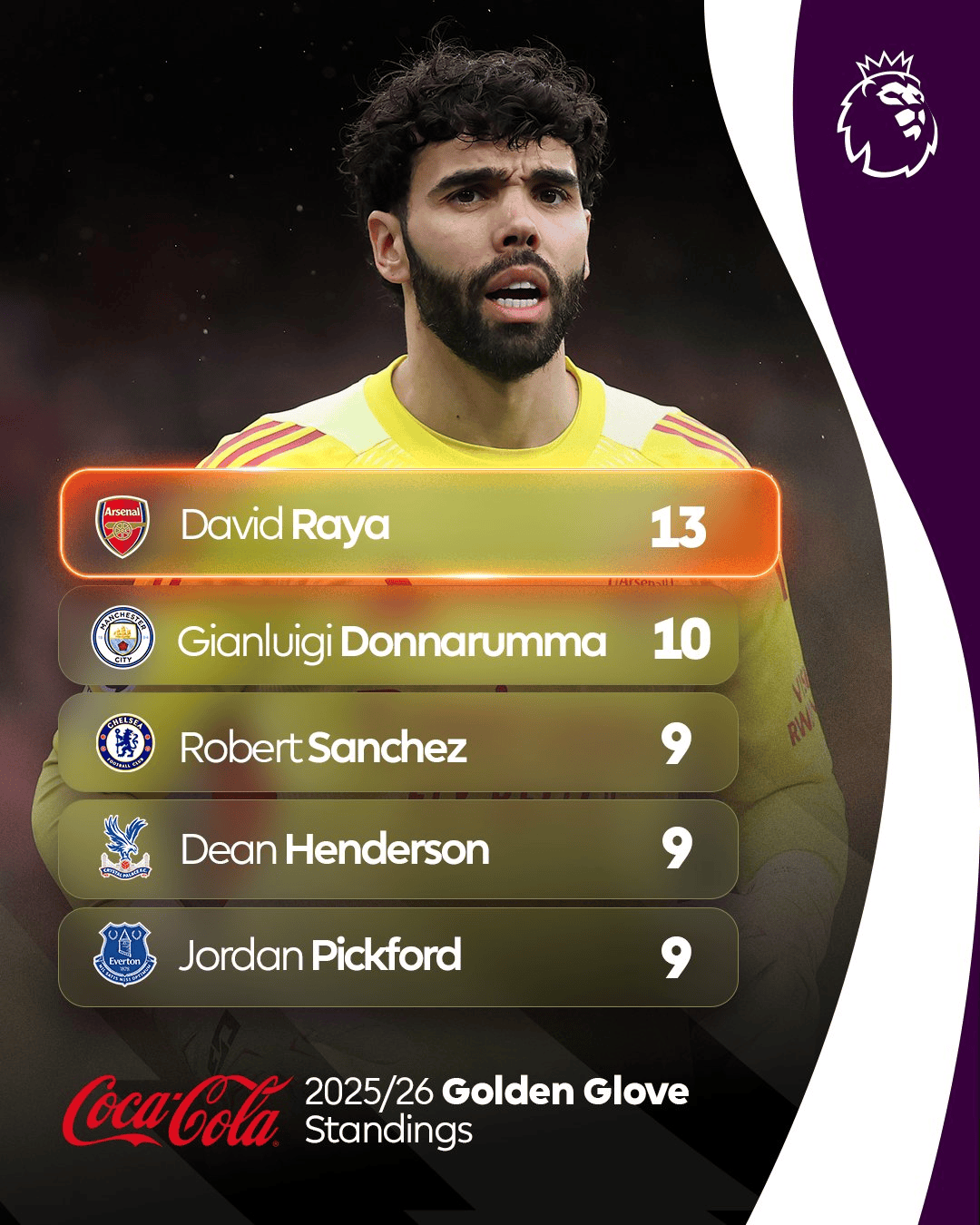 本赛季英超门将零封榜:拉亚13次居首,多纳鲁马10次第二