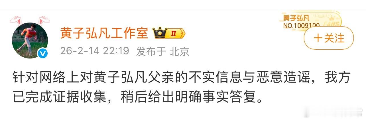 黄子弘凡工作室回应:针对网络上对黄子弘凡父亲的不实信息与恶意造谣,我方已完成证据收集,稍后给出明确事实答复
