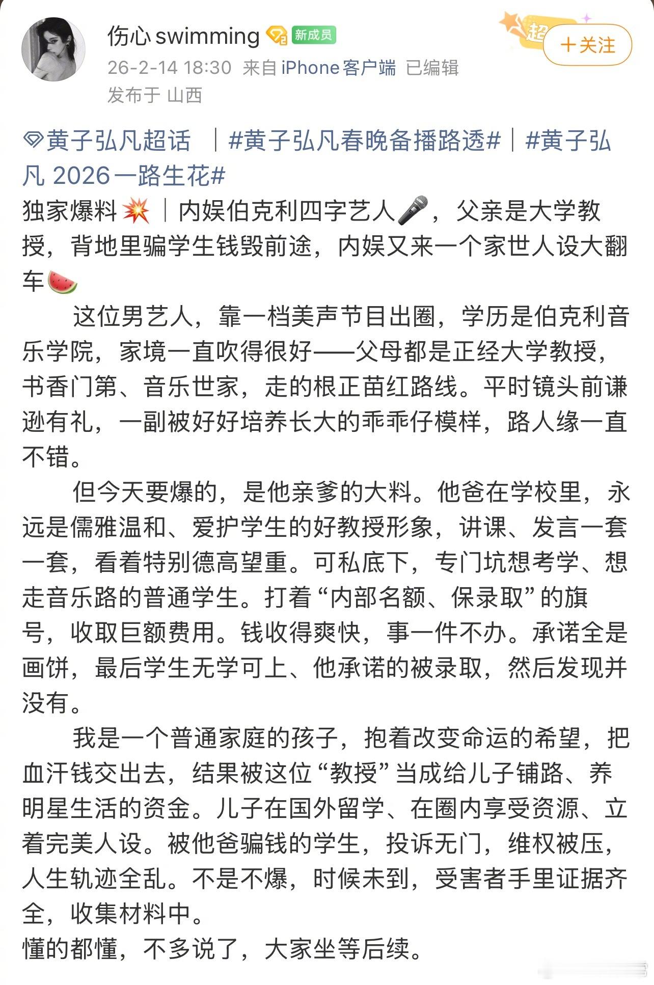有网友爆料黄子弘凡他爸
