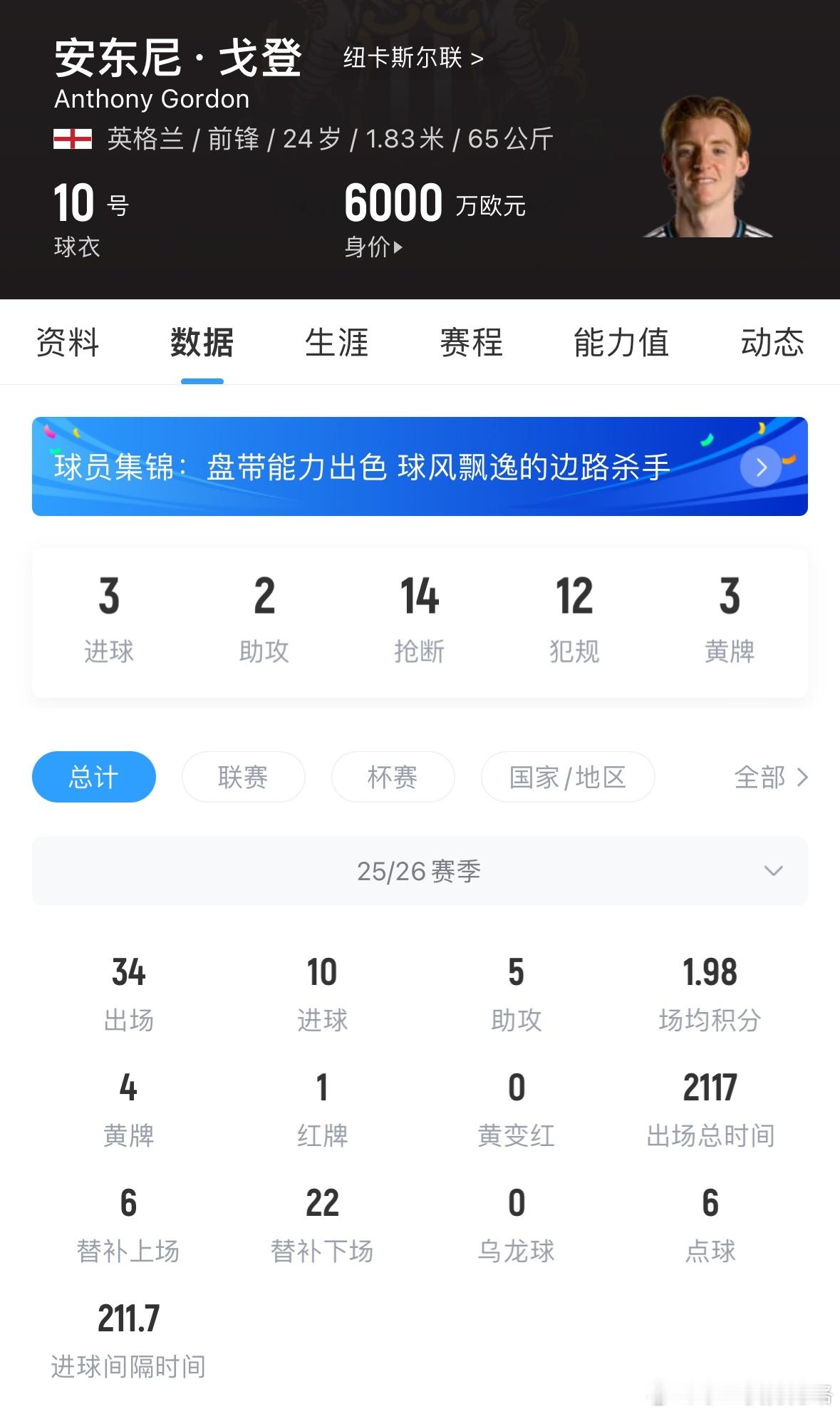 纽卡则将全力阻止戈登的转会,除非能收到大约8500万镑甚至9500万镑的转会费,否则他们不会考虑进行谈判。戈登现年24岁,他本赛季出场34次,贡献10球5助,现身价6000万欧。