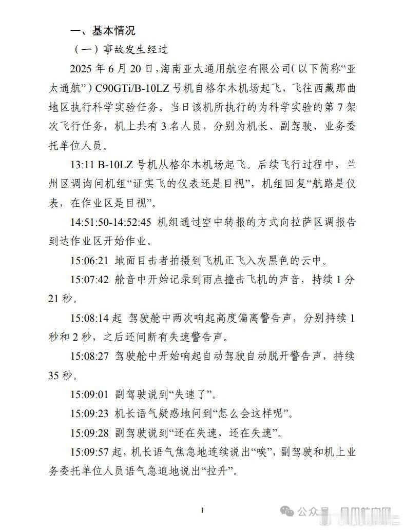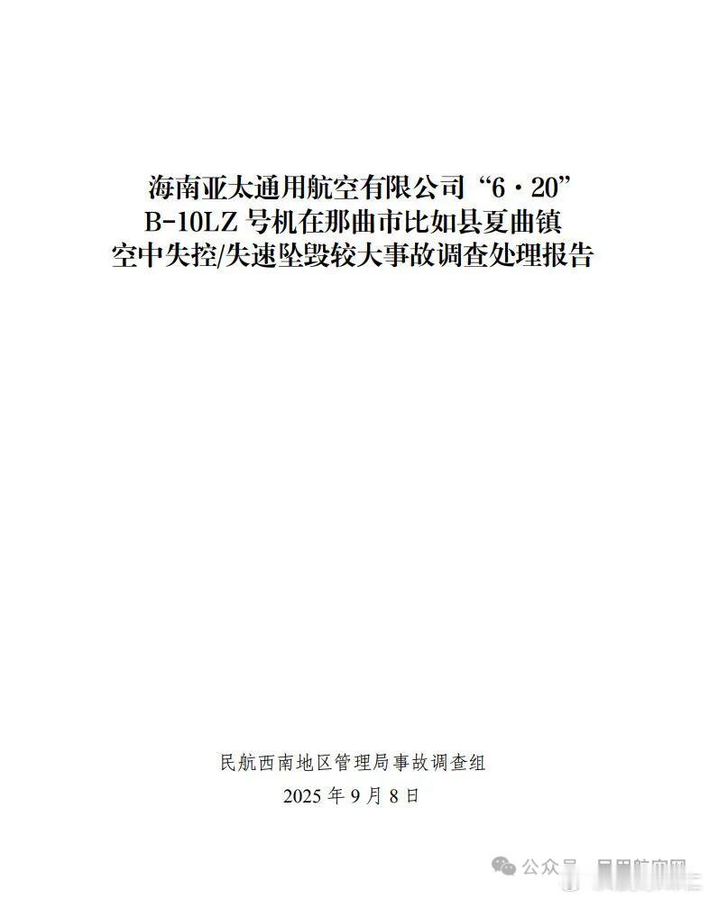 2月13日,中国民航西南管理局向社会公布《海南亚太通用航空有限公司“6·20”B-10LZ号机在那曲市比如县夏曲镇空中失控/失速坠毁较大事故调查处理报告》。报告显示,2025年6月20日,亚太通航C90GTi/B-10LZ号机自格尔木机场起飞,飞往西藏那曲地区执行科学实验任务。当日15:10,飞机坠毁,事故造成机上3人死亡。报告指出,此次事故的直接原因为:机组未操纵飞机避开有威胁的云团,飞机在云中失速,未能及时改出而坠毁。导致飞机失速的最大可能原因为云中严重结冰。