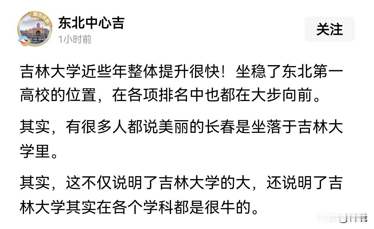 吉林大学是近些年东北高校里下降最严重的高校,各项主流高校排名吉林大学已经从原来的10几名快跌出30名了,你是不知道还是在故意说假话啊? 再说从哪儿来的“坐稳第一”啊?东北高校第一一直都是“哈尔滨工业大学”,从来就没改变过,你知道什么是“C9”不? 实事求是是大学精神,不具备大学精神,就不要评论大学。@东北中心吉