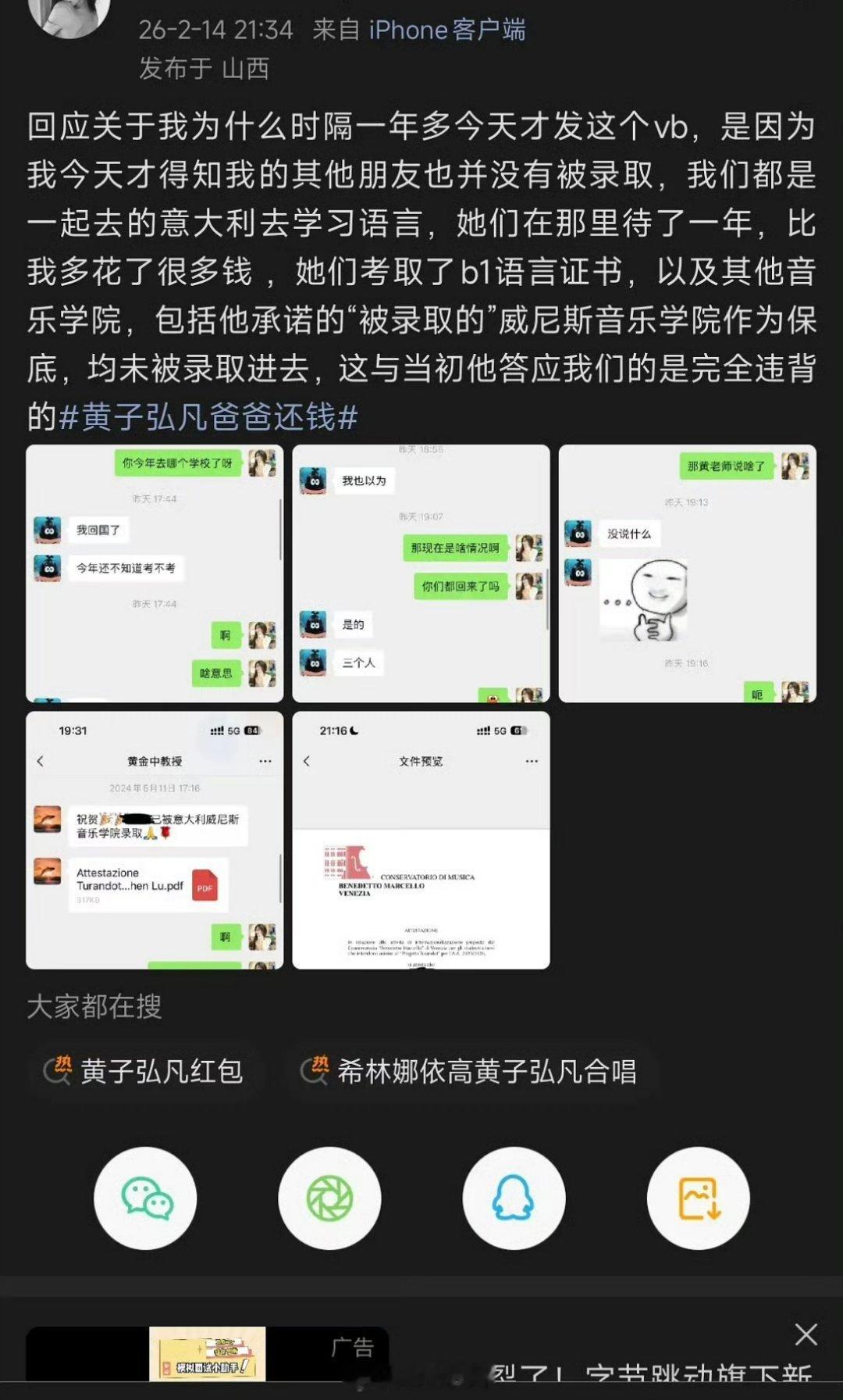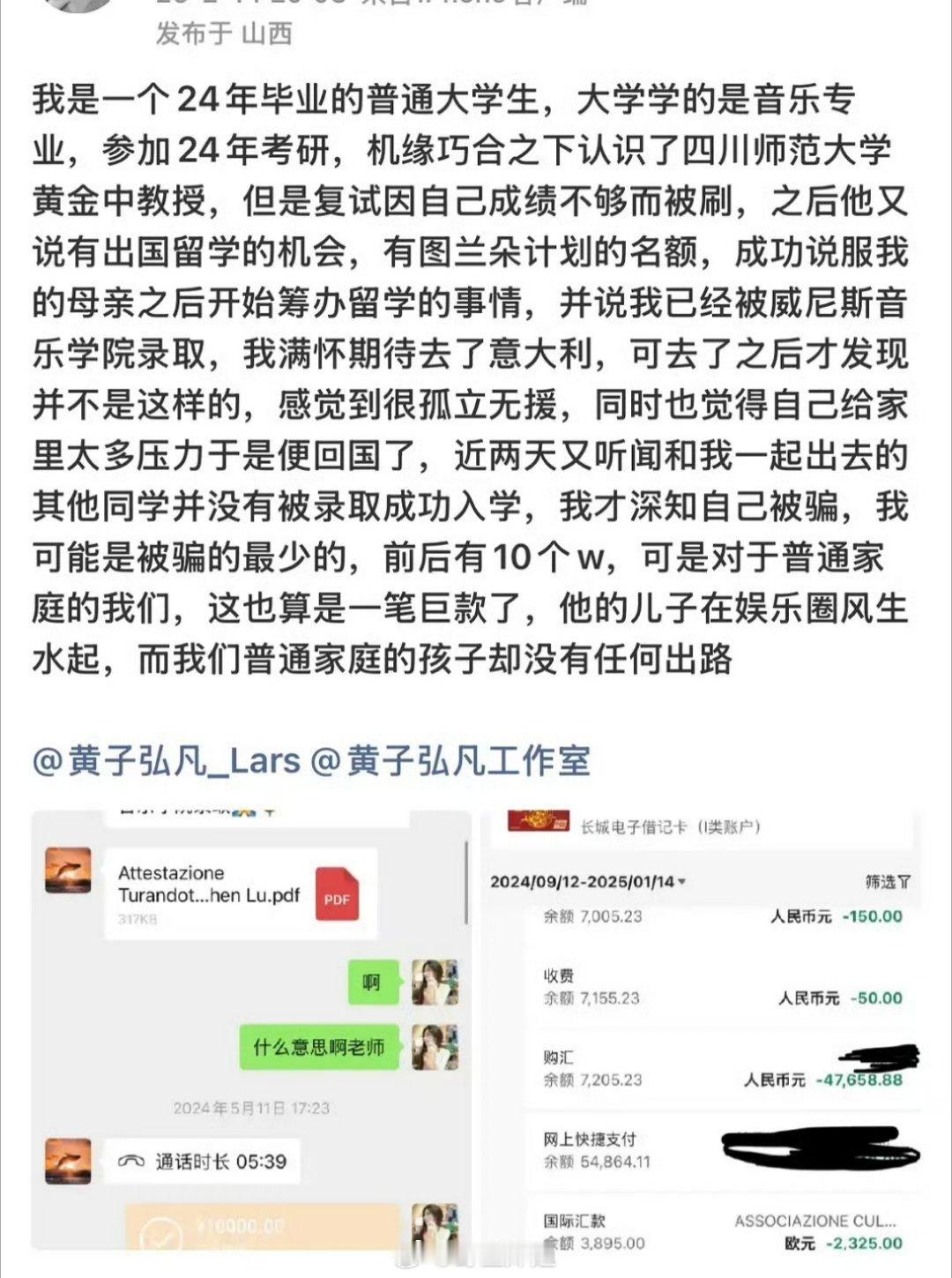 有网友出来爆料称黄子弘凡的父亲作为老师还骗取学生的钱,说好的音乐报送,花了10w+,结果都是假的,坐等一个回应啊