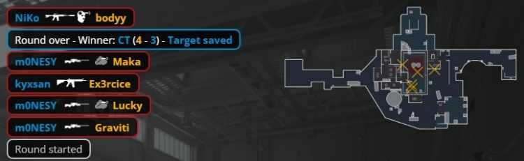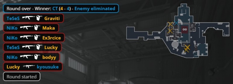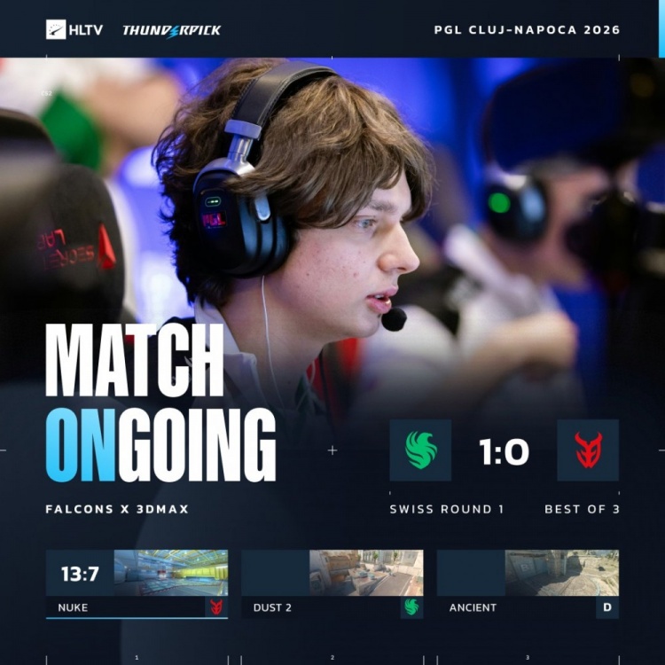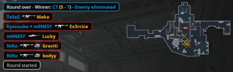 上半场最后一回合,Niko外场混烟打掉bodyy,Niko随后再穿掉Graviti,3DMAX一波“chopper”转A,四人走正门被完美团灭,猎鹰以7-5结束上半场。