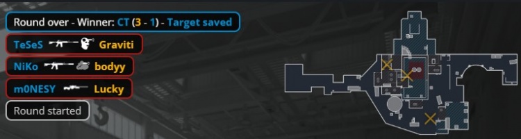 上半场3DMAX先攻,手枪局maka外场先杀Niko,3DMAX夹B区得手拿到首分。次回合孩神掏出鸟狙上三楼上爆头Lucky,ex3rcice咖喱A点双杀,龙哥残局1v2打掉ex3rcice后被boddy架死,3DMAX拿到第2分。次回合猎鹰纯E,京介铁板沙鹰双杀被打掉,Graviti双杀收尾,3DMAX连拿3分。