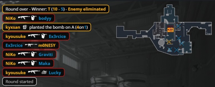 来到长枪回合,Niko单人peek近点双杀Maka与Graviti,京介K1门口回头打掉ex3rcice,bodyy保枪被Niko打掉,Niko单人三杀,猎鹰拿到第10分。