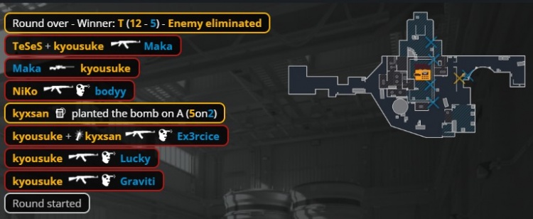 第10回合长枪局,K3先进管道等人被Maka一把Tec-9打掉,3DMAX难在B区下包,龙哥双杀收尾拿到第6分。次回合3DMAX上管道转A,京介残局1v3进A打掉ex3rcice后被Maka打掉,3DMAX拿到第5分。