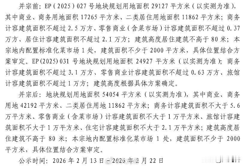 光谷高新四路5.6万方商务、1万方零售项目近日,武汉新城光谷安居投资发展有限公司EP(2025)027、031 地块规划设计条件并宗批前公示正式发布。 本次公示围绕两宗地块统一规划、合并实施展开,旨在优化土地利用结构,提升空间使用效率,契合武汉新城建设与光谷片区高品质开发导向。公示期间,相关单位与市民可按程序提出意见建议,后续将依据审批结果推进项目落地,为区域居住与配套建设增添新支撑。 P(2025)133号地块位于东湖新技术开发区高新四路以南、中芯一路以北、光谷一路以东、流芳园中路以西。该地块规划用地面积为24927平方米。规划用地性质为商业用地、商务用地。国有建设用地使用权出让年限为40年。商务计容建筑面积不超过3.1万方,零售商业计容建筑面积不超过0.63万方,旅馆计容建筑面积不超过1万方。加上前段时间出让的P(2025)103号地块,商务不超2.5万方,零售商业不超0.37万方,此处将新增5.6万方的商务,零售1万方。