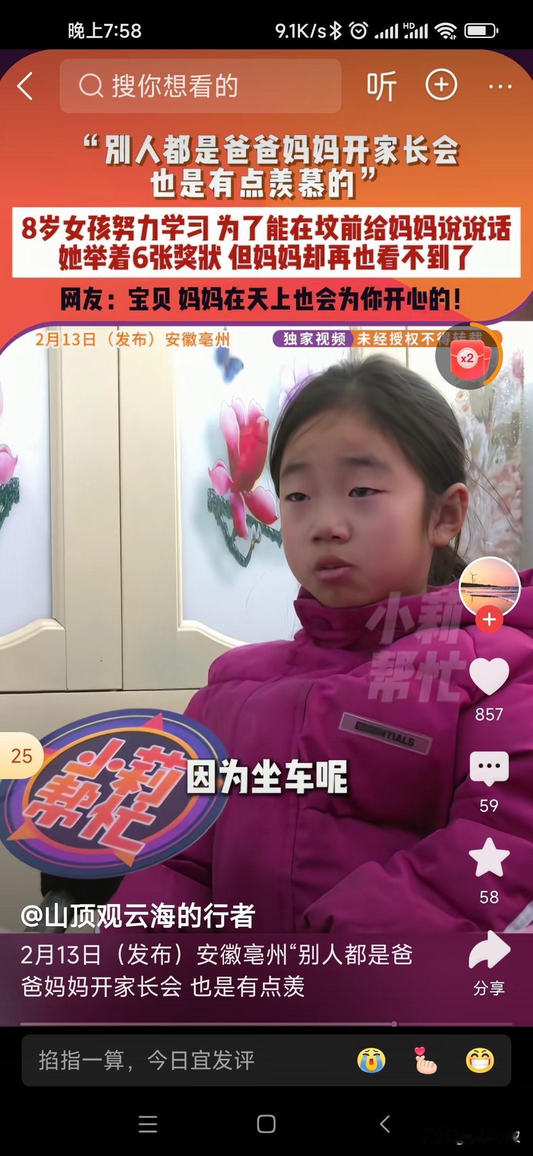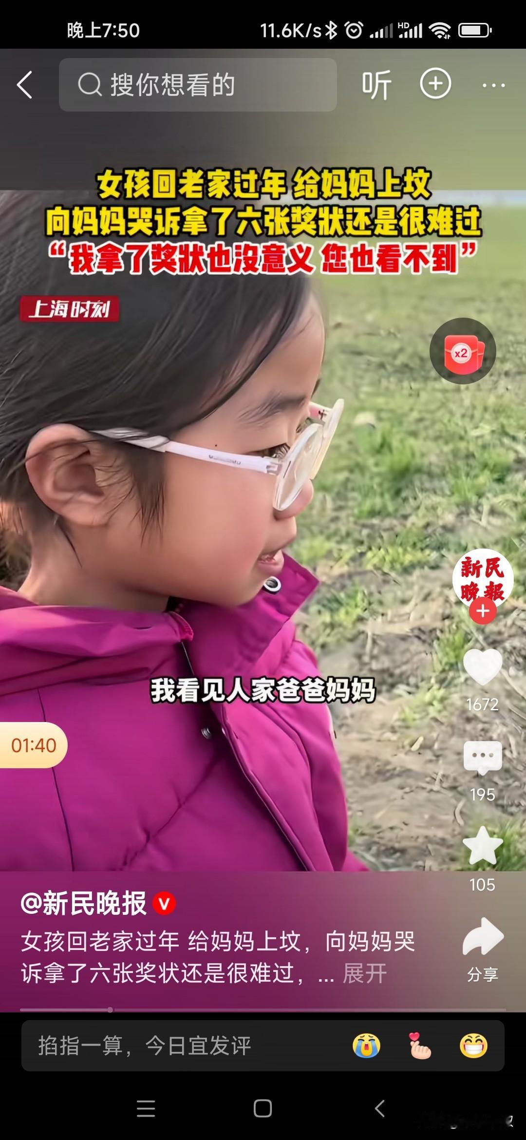 大过年的,安徽这个小女孩太可怜了。万家灯火缺给不了孩子一个幸福的家。 过年放假,回老家过年那一件对孩子来说都是一件特别幸福的事,可这个小女孩跟随姑姑径直来到了田地里的孤坟,早已泪如雨下,哭着跟地下妈妈说:今年得了六张奖状,可惜妈妈看不到,没有意义。 真的不知道怎么安慰孩子,才能减少失去妈妈的痛苦。孩子你拿的奖状很有意义,你妈妈一定很开心。