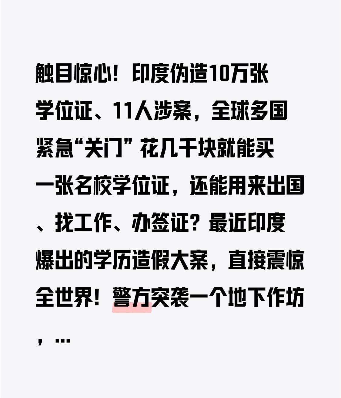 触目惊心!印度伪造10万张学位证、11人涉案,全球多国紧急“关门” 花几千块就能买一张名校学位证,还能用来出国、找工作、办签证?最近印度爆出的学历造假大案,直接震惊全世界!警方突袭一个地下作坊,当场搜出10万+张伪造学位证,涉案11人全部落网,一条黑色产业链彻底曝光。 你敢想吗?这些假证不是小打小闹的复印件,而是高仿复刻:仿冒马德拉斯大学、海德拉巴大学等20多所印度正规名校,本科、硕士、MBA应有尽有,水印、钢印、学籍信息一应俱全,外行根本辨不出真假。 更疯狂的是,造假团伙明码标价:本科约3900元、硕士约7800元,中介拉客、作坊制证、全程包售后,专门卖给想出国务工、留学的人。不少人拿着假证,成功骗过欧美、澳洲签证官,堂而皇之地出境入职,甚至混进医疗、工程、护理等关键岗位。 一开始大家以为只是小作坊乱搞,转折点来了!这根本不是个案,而是系统性造假。警方调查显示,已流入市场的假证可能高达数十万张,形成“印刷—中介—出境”一条龙黑产。 事件曝光后,全球炸锅!澳大利亚、德国等国紧急全面收紧印度签证审核,加大学历查验力度,大批造假者被遣返,无数正规求学、求职的印度人,被一颗老鼠屎连累,遭遇信任危机。 一张假证,击穿教育公平,威胁公共安全,透支国家信誉。真正的学历,是寒窗苦读的证明;真正的竞争力,是真才实学,不是投机取巧。靠造假走捷径,也许能瞒一时,终究瞒不过一世,最后只会自食恶果。 这起丑闻也给所有人敲响警钟:诚信是立身之本,造假必被严惩。无论是求学还是工作,脚踏实地,才是最稳的路。 支持严打学历造假、守护公平正义的,点赞转发,让更多人明白:人间正道,从来没有捷径!