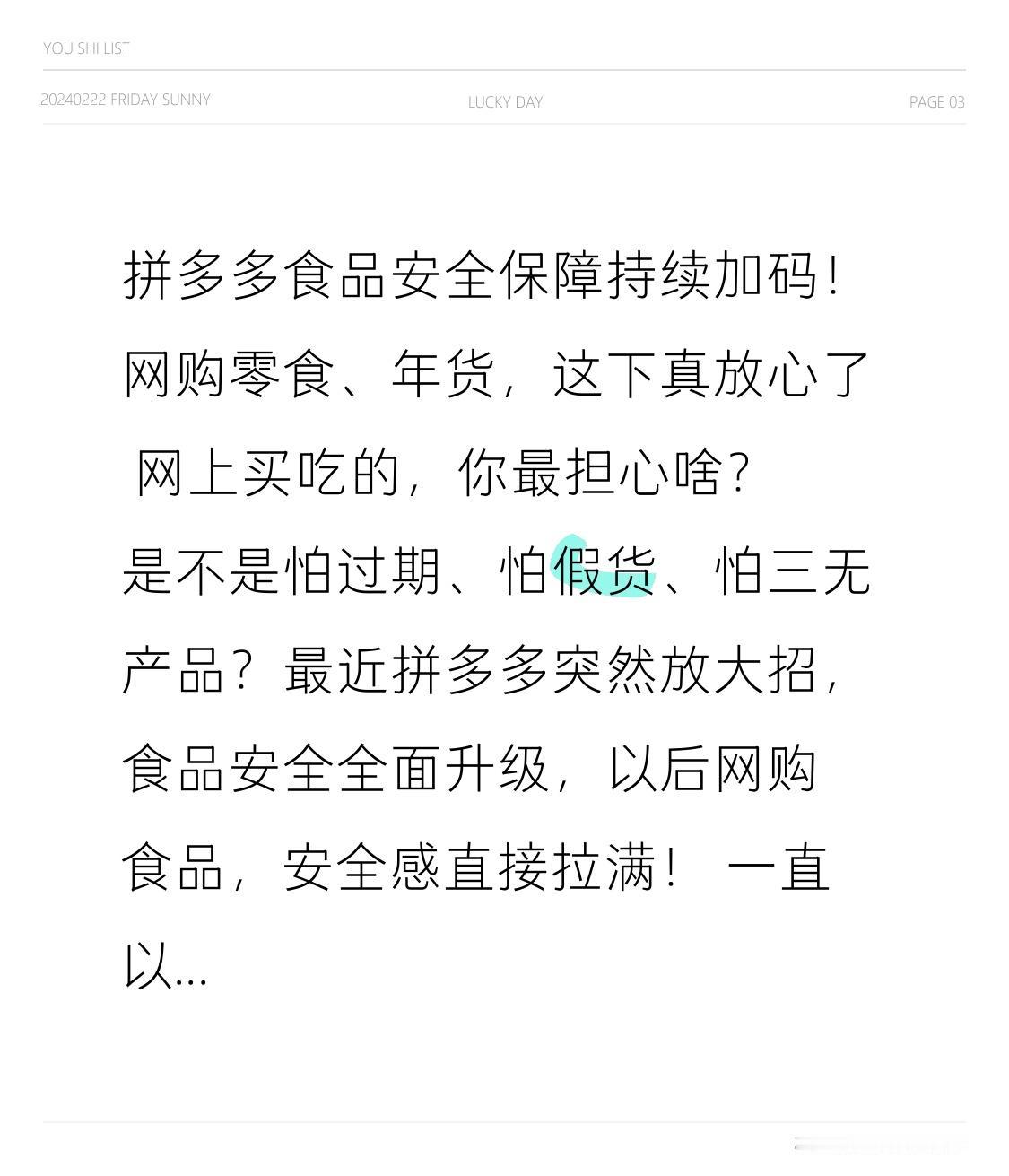 拼多多食品安全保障持续加码!网购零食、年货,这下真放心了 网上买吃的,你最担心啥?是不是怕过期、怕假货、怕三无产品?最近拼多多突然放大招,食品安全全面升级,以后网购食品,安全感直接拉满! 一直以来,大家对网购食品又爱又怕:便宜实惠、种类多,可一不小心就踩坑,小到过期变质,大到三无乱添加,吃进肚子里,全家都揪心。尤其是春节囤年货,糕点、肉类、零食、生鲜,量大种类杂,安全问题更是牵动千万家庭。 就在大家还在纠结要不要下单时,转折点来了!拼多多正式宣布:食品安全保障持续加码,从源头到售后,全链条严管! 首先是商家资质卡死关:食品店铺必须证照齐全,平台高频复核资质,冷加工糕点、熟食等重点品类,额外要求提交生产明细,缺一样都不能上架。AI算法24小时巡查,虚假宣传、AI修图造假,直接拦截、下架、关店! 其次是常态化抽检不手软:联合国家级检测机构,周周检、月月检,覆盖零食、生鲜、粮油、年货等全品类,不合格立刻下架,绝不留情。 最给力的是售后兜底更安心:假货直接假一赔十,问题食品快速赔付,从买到吃,全程有保障。同时配合市场监管总局公约,一处违规、全网受限,违规商家想换马甲重来,根本没门! 从“能买到”到“买得放心”,拼多多这波升级,不只是平台自律,更是对老百姓餐桌的负责。便宜不等于将就,实惠更要安全。 民以食为天,食以安为先。不管是日常买菜,还是春节囤货,安全永远是第一位。平台越严格,我们越安心;监管越到位,家人越健康。 支持电商严抓食品安全,让放心网购走进每个家庭!觉得这波举措给力的,点赞转发,让更多人放心囤货~