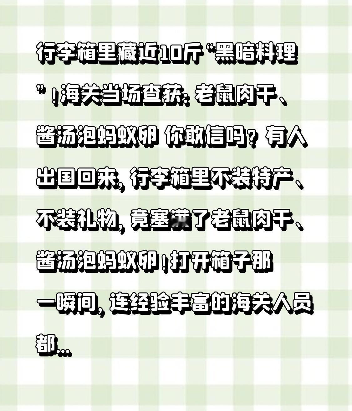 行李箱里藏近10斤“黑暗料理”!海关当场查获:老鼠肉干、酱汤泡蚂蚁卵 你敢信吗?有人出国回来,行李箱里不装特产、不装礼物,竟塞满了老鼠肉干、酱汤泡蚂蚁卵!打开箱子那一瞬间,连经验丰富的海关人员都惊呆了。 近日,长沙黄花机场海关,在查验入境行李时,发现一件行李机检图像异常。开箱一看,里面足足4.74公斤,全是未经检疫的动物制品:风干老鼠肉、泡在酱汤里的蚂蚁卵,还有来路不明的猪肉制品。旅客面对询问,淡定表示:都是自己吃的。 这话一出,网友直接炸锅:这也敢吃?这也能带? 很多人觉得,不就是点特色小吃吗,至于这么严吗?转折点来了:这真不是小题大做!这些东西看着是“家乡味”,实则是生态炸弹、健康杀手。 未经检疫的鼠肉,可能携带多种寄生虫、致病菌、病毒;蚂蚁卵与不明酱汤,藏着外来有害生物与虫卵,一旦流入环境,就是物种入侵。之前的非洲大蜗牛、加拿大一枝黄花,就是因为管控不严泛滥成灾,治理成本数以亿计。更别说违规肉类可能携带非洲猪瘟等疫情,一旦扩散,整个养殖业都要遭殃。 根据我国明令规定,生熟肉类、动物制品、昆虫及虫卵,全都禁止携带入境。不管是自己吃、送朋友,还是偷偷夹带,只要入境就是违法。 有人说:我就是念着家乡那一口。但乡愁不能以身试法,口味更不能无视安全。海关严查,不是为难人,而是守住国门生物安全,守住我们每个人的餐桌与健康。 别等真出了事才后悔,别因为一口吃的,触犯法律、危害生态。出国旅行,别乱带、别乱尝,遵守规定,才是对自己、对家人、对国家负责。 支持海关严格把关,守护国门安全的,点赞转发,让更多人记住这条红线!