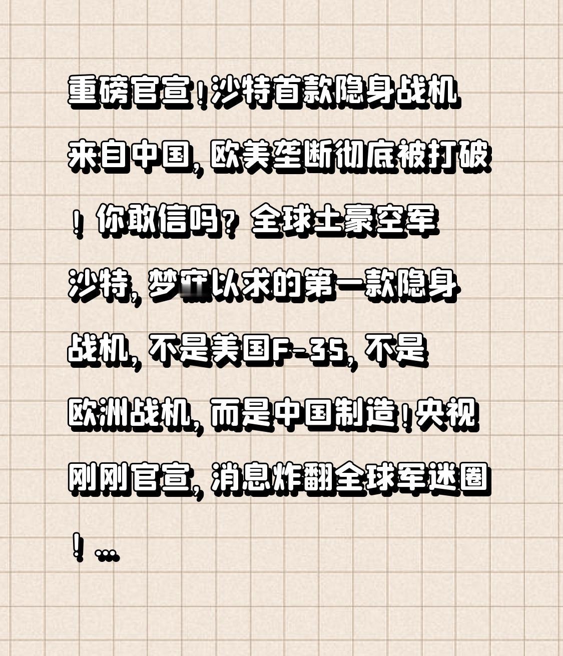 重磅官宣!沙特首款隐身战机来自中国,欧美垄断彻底被打破! 你敢信吗?全球土豪空军沙特,梦寐以求的第一款隐身战机,不是美国F-35,不是欧洲战机,而是中国制造!央视刚刚官宣,消息炸翻全球军迷圈! 一直以来,隐身战机就是大国重器的代名词,美国牢牢霸占出口市场,沙特求了F-35多年,却处处被卡脖子:要么不卖,要么附加苛刻条件,有钱都买不到尊严。沙特空军急缺隐身战力,却只能在欧美限制下忍气吞声。 就在所有人以为沙特只能妥协时,惊天转折点来了! 我国翼龙-10B隐身察打一体无人机,正式成为沙特列装的首款隐身战机,这也是中国首款出口的隐身作战平台,一举创下两个“世界第一”! 这款战机有多硬核?隐身设计、高空高速、长航时续航,能侦察、能精确打击,还可挂载导弹执行高危突防任务,完全适配沙特实战需求。更给力的是,我们不仅卖战机,还提供技术转让+本土生产,帮沙特打造自己的军工体系,这是欧美绝对不肯给的待遇! 从过去买不到、受限制,到如今选择中国高端隐身装备;从我们模仿别人,到我们出口隐身战机,这背后是中国军工的硬核崛起,是中国制造从跟跑到领跑的逆袭! 这不仅是一笔军贸订单,更是国际格局的悄然改变:有实力才有话语权,有技术才有合作权。我们不搞霸权、不设门槛,用实力赢得尊重,用诚信收获伙伴。 看到祖国越来越强大,每一个中国人都由衷自豪。从无人机到隐身战机,从日常制造到高端科技,中国力量正在惊艳世界。 为中国军工点赞!为大国崛起骄傲!觉得振奋的,点赞转发,让世界看见中国智造的硬实力!