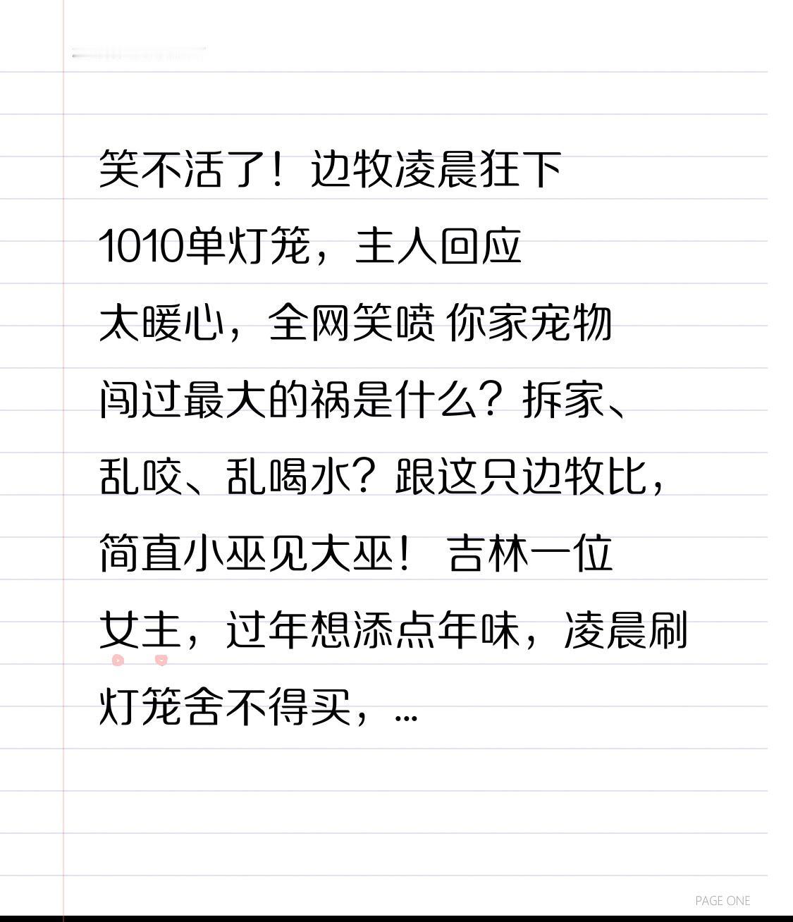 笑不活了!边牧凌晨狂下1010单灯笼,主人回应太暖心,全网笑喷 你家宠物闯过最大的祸是什么?拆家、乱咬、乱喝水?跟这只边牧比,简直小巫见大巫! 吉林一位女主,过年想添点年味,凌晨刷灯笼舍不得买,嫌贵睡着了。万万没想到,凌晨四点,她家边牧扒拉手机,一顿狂点,直接下单1010多个灯笼,还全走先用后付! 第二天快递堆成山,朋友帮忙代收,老公以为是老婆精心准备的年货,二话不说叫师傅上门安装。等女主下班回家,梯子架着、电钻响着,家里快装成“大唐不夜城”,想退都来不及了! 一开始女主又气又笑,血压飙升:本来只想花几百,这下直接花掉好几千,这哪是养狗,这是养了个“家庭采购总监”啊!网友直接炸锅:一个敢买、一个敢收、一个敢装,这家庭配合度,绝了! 就在大家等着看女主“教训”狗狗时,暖心转折点来了! 主人亲自出面回应,没有生气,反而哭笑不得地说:装都装了,就当给家里添年味了,狗狗也是想让家里更热闹。她把挂满灯笼的视频发出来,红彤彤一片,喜气洋洋,原本的糟心事,瞬间变成全网最暖的新年趣事。 大家这才明白,边牧不是故意败家,只是模仿主人的动作,误打误撞,给家里安排了一场超有仪式感的新年灯会。 这件事笑翻全网,也戳中了很多人。养宠物的意义,不就是这样吗?偶尔闯祸、经常治愈,它们不懂金钱,却用最笨拙的方式,陪着我们、温暖我们。 小时候盼过年,是盼新衣盼红包;长大后懂过年,是盼家人平安、盼身边有伴、盼家里有光。这1010个灯笼,照的不是家,是藏在烟火里的温柔与陪伴。 新的一年,愿我们都有热热闹闹的家,有可可爱爱的伴,日子红红火火,岁岁平安喜乐。