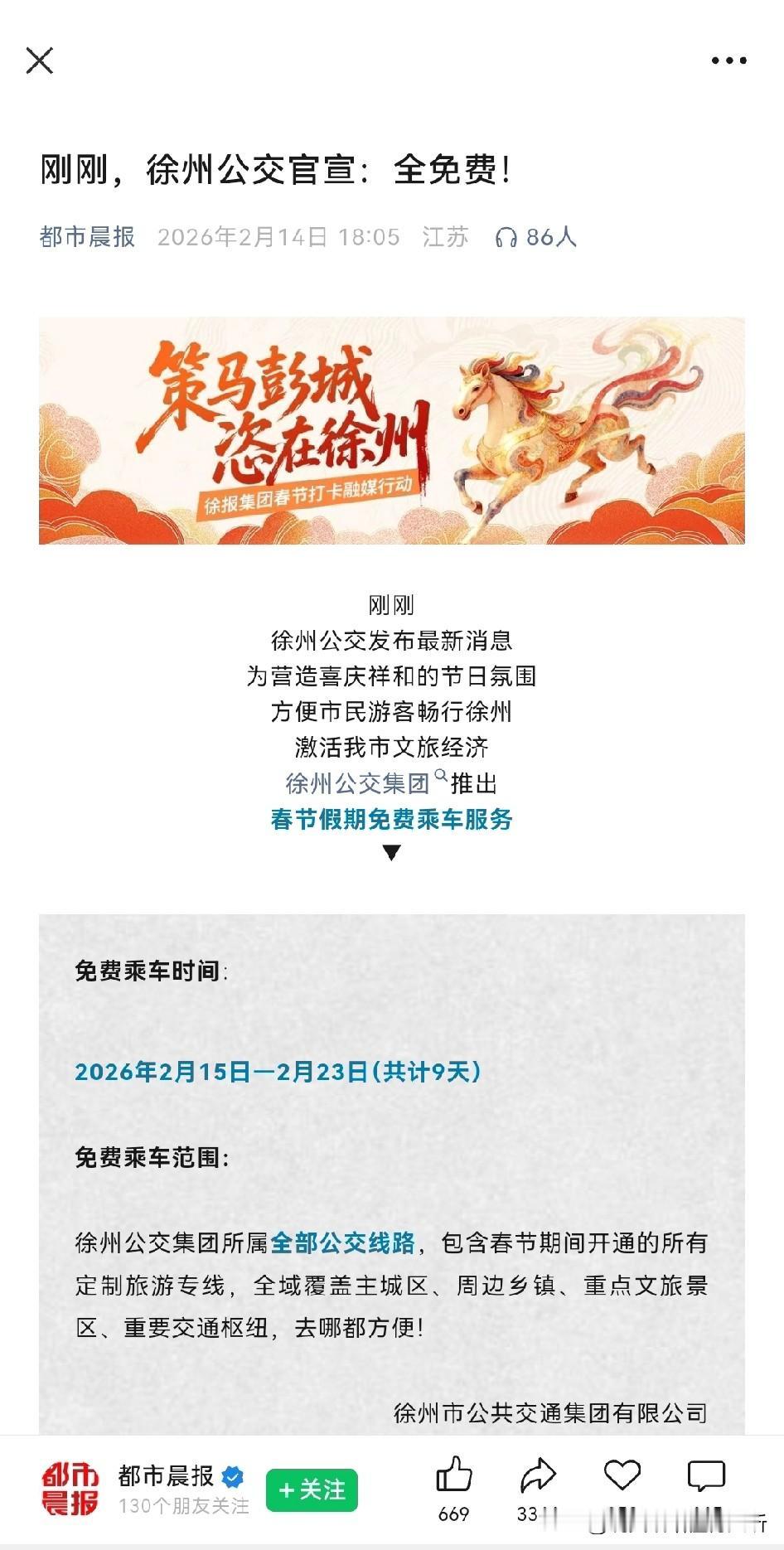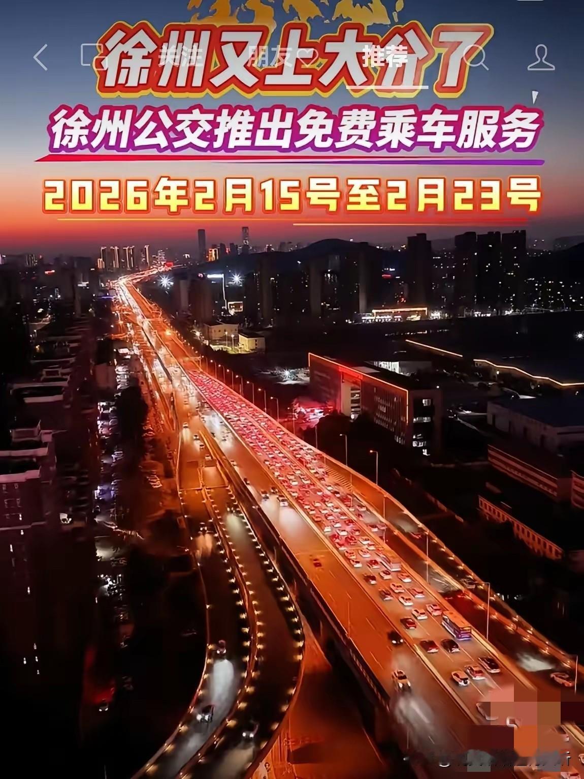 徐州春节期间所有公交车免费,点个赞[赞]