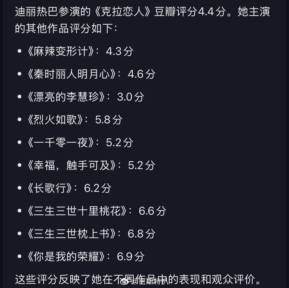 “这些评分反映了她在不同作品中的表现和观众评价。”迪丽热巴作品豆瓣评分