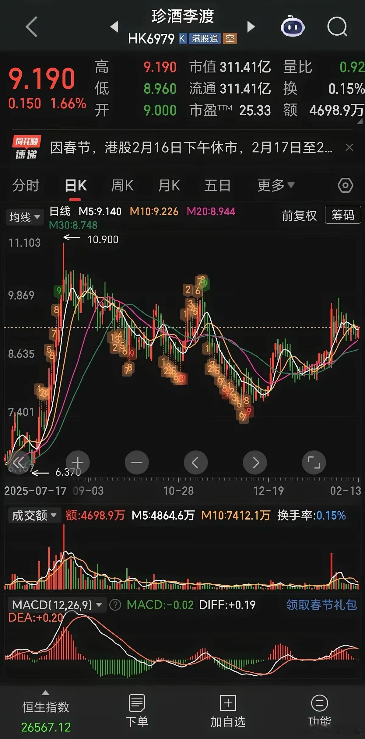 今日颁布的酿酒品质提质升级政策相当给力,可惜大A正值春节休市,想了解白酒板块表现如何还得等一周多时间。不过这也无妨,不妨提前瞧瞧周一港股的两只白酒股——珍酒李渡和杜甫酒业的表现如何?我坚信它们不会令人失望,毕竟已经调整了5年,如此重磅的政策可不多见。 期待中……