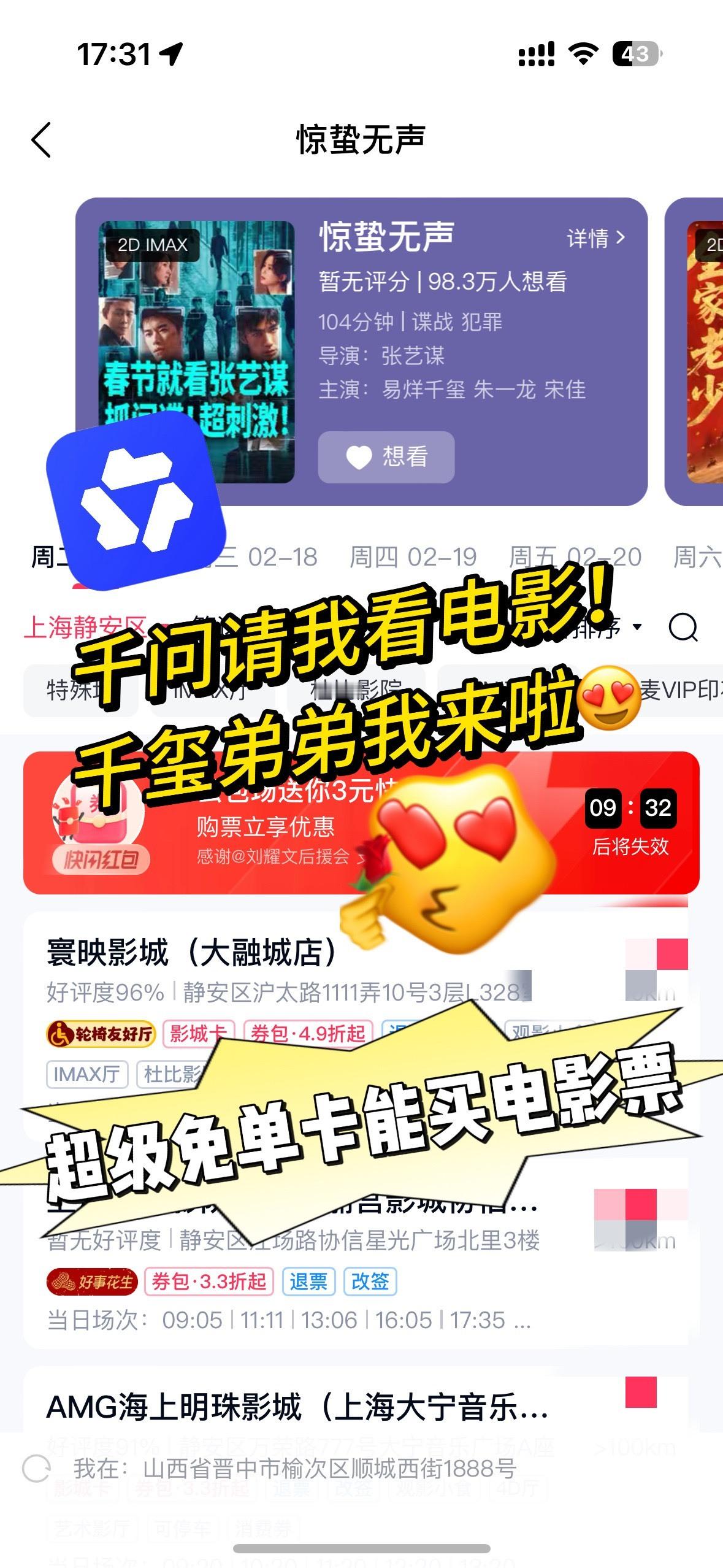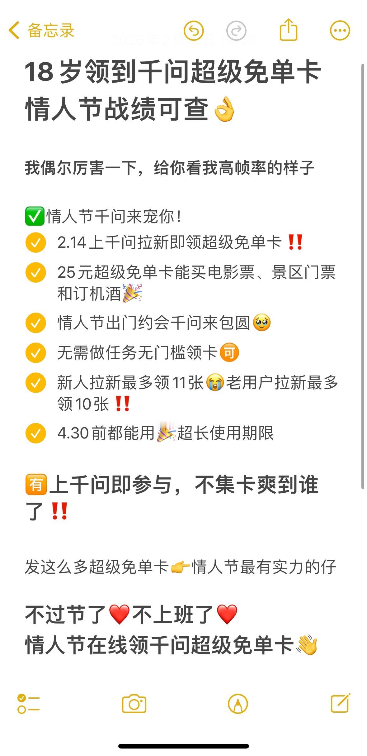 情人节发现男朋友联系高中女同学 为了千问超级免单卡,我连前任都喊来帮忙了!🤣 本来还尴尬,结果前任秒回:“就这?我帮你拉我现任一起!”每邀1个新用户得1张,最多可再领10张,一直可以用到4月30号!别说前任,仇人只要能帮我薅卡,我都能说一句“谢谢老铁”!千问超级免单卡能买年货能买票用免单卡买了电影票,别问情人节怎么过,问就是“用千问的卡,把快乐安排得明明白白”。千问超级免单卡再加3天