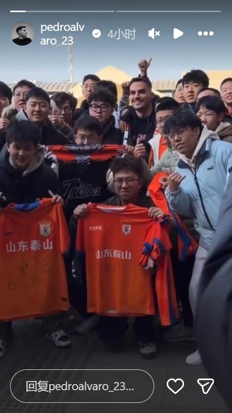 佩德罗·阿尔瓦罗在社媒晒出泰山球迷欢迎他的照片,同时配文:谢谢大家难以置信的欢迎和支持,新的队徽,同样的激情,同样的饥渴感,期待新篇章。