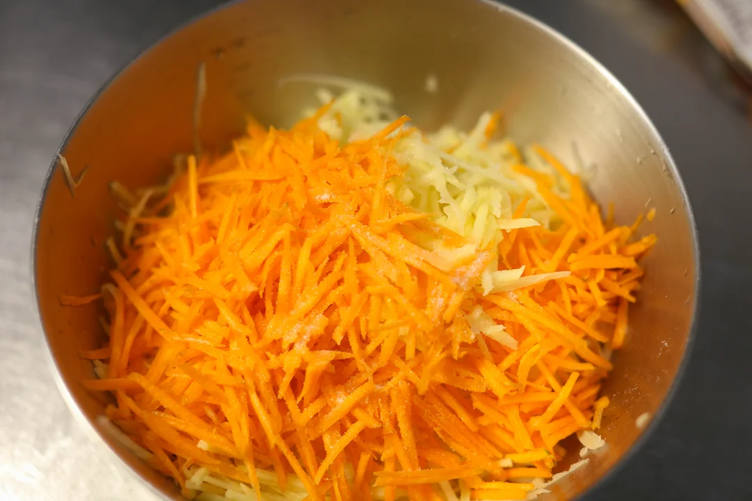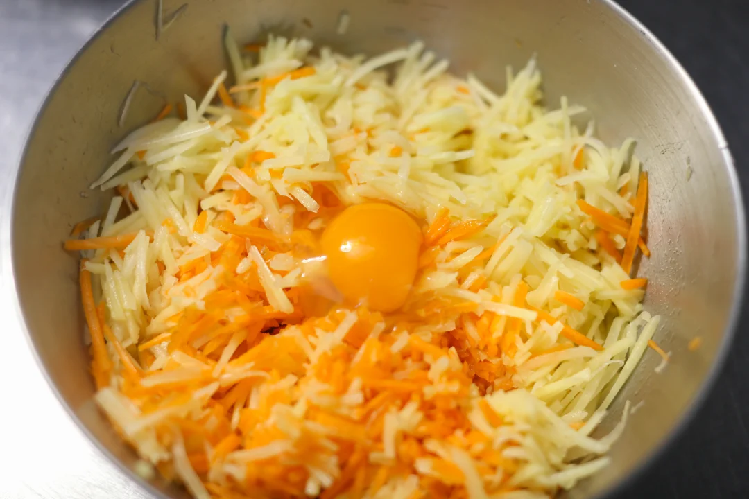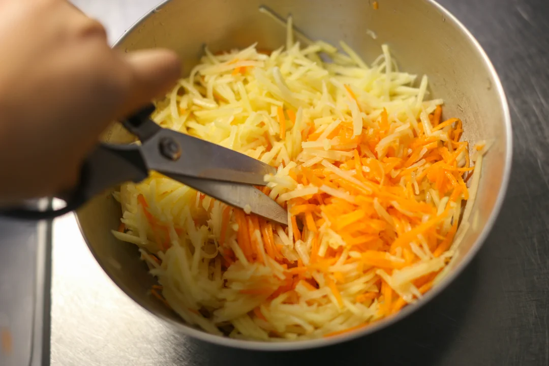 • 1:把土豆和胡萝卜清洗干净之后,用厨房小工具分别把他们擦成丝。