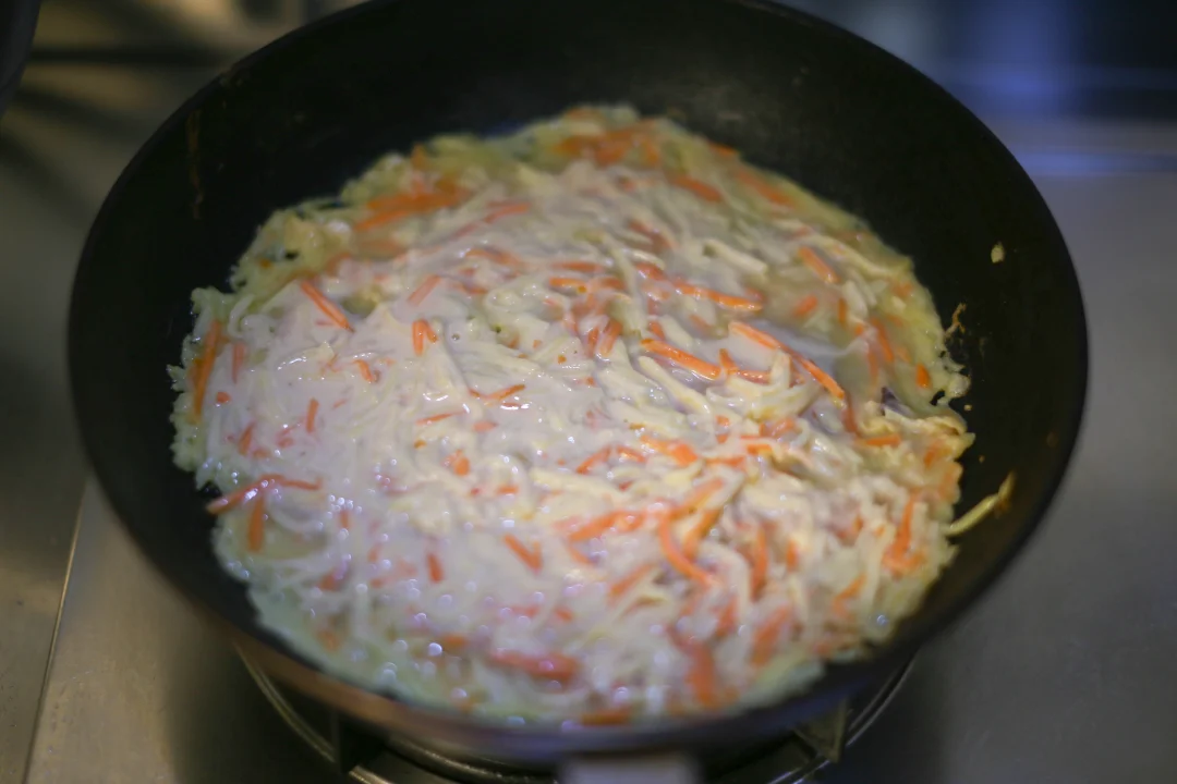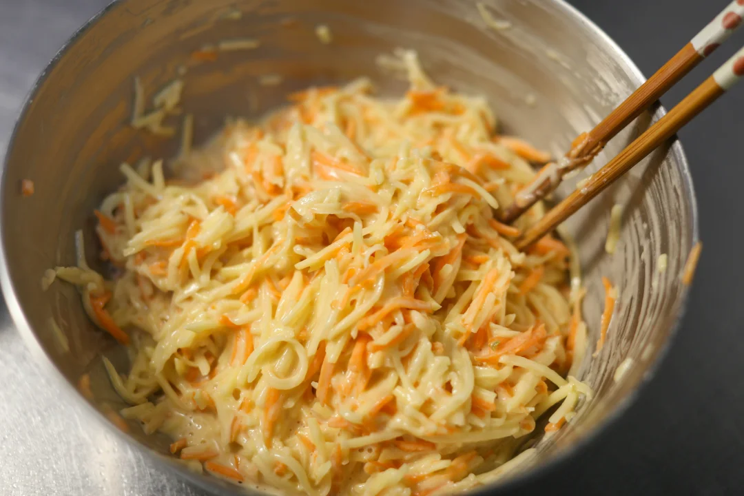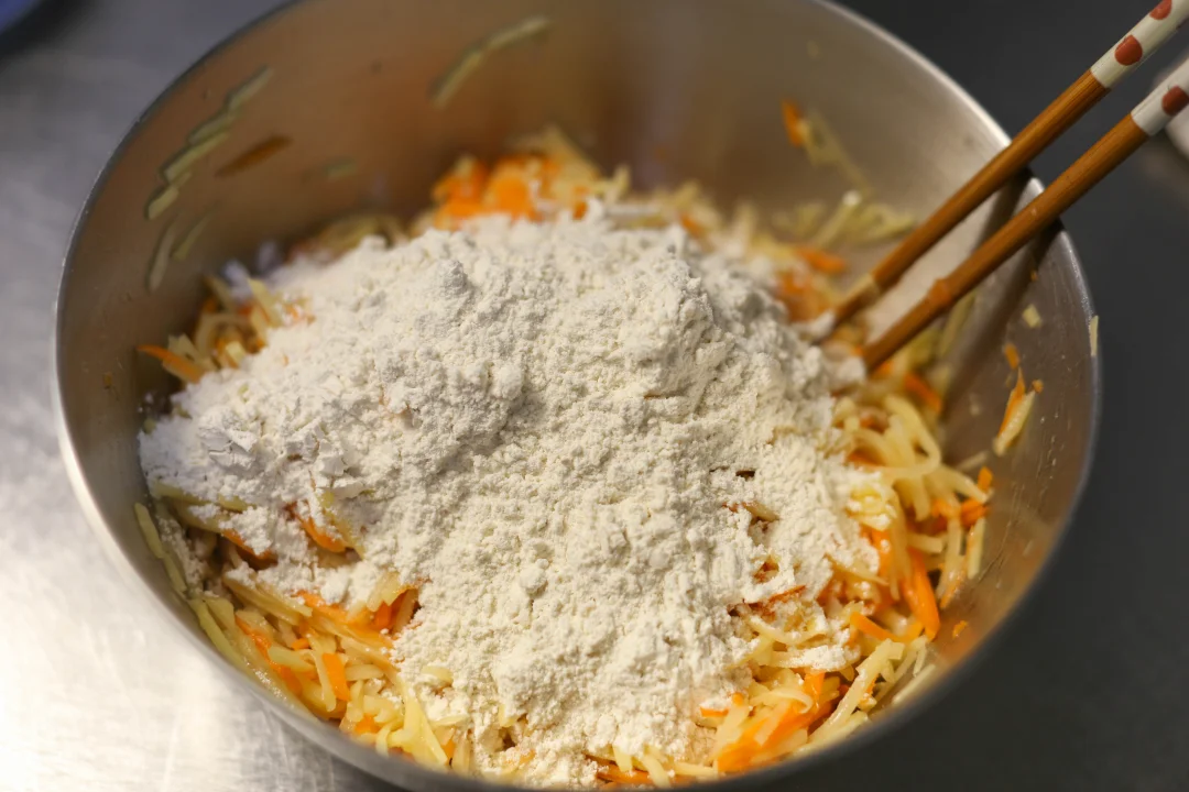 • 4:让鸡蛋和土豆丝和胡萝卜丝充分融合之后,加入煎饼粉。
