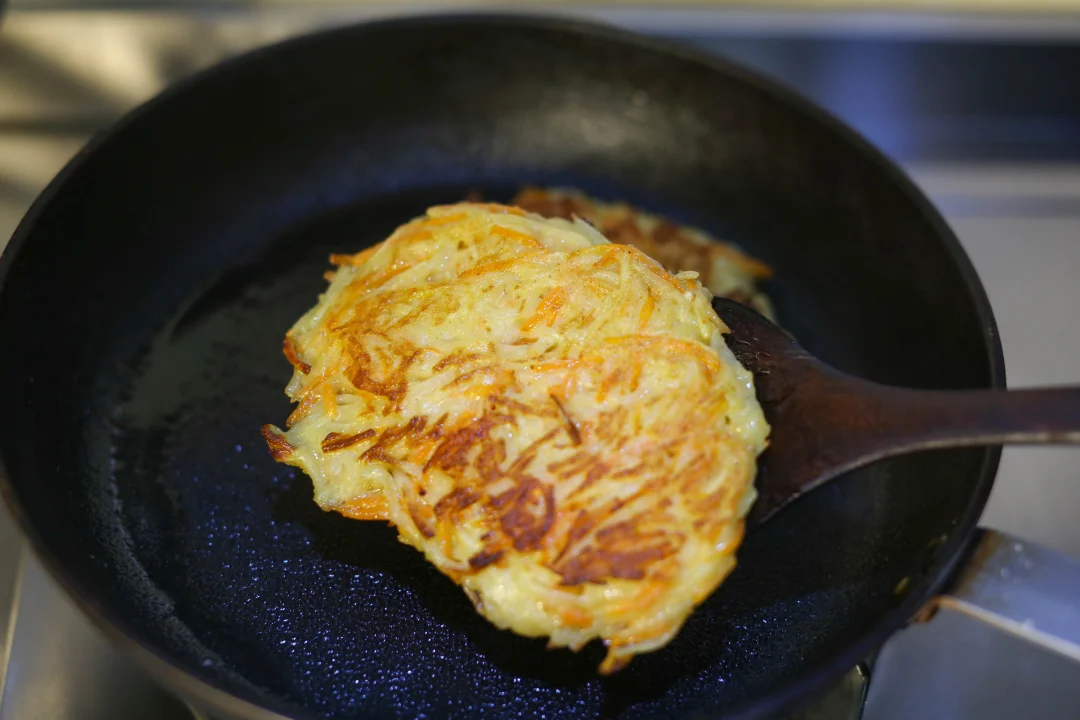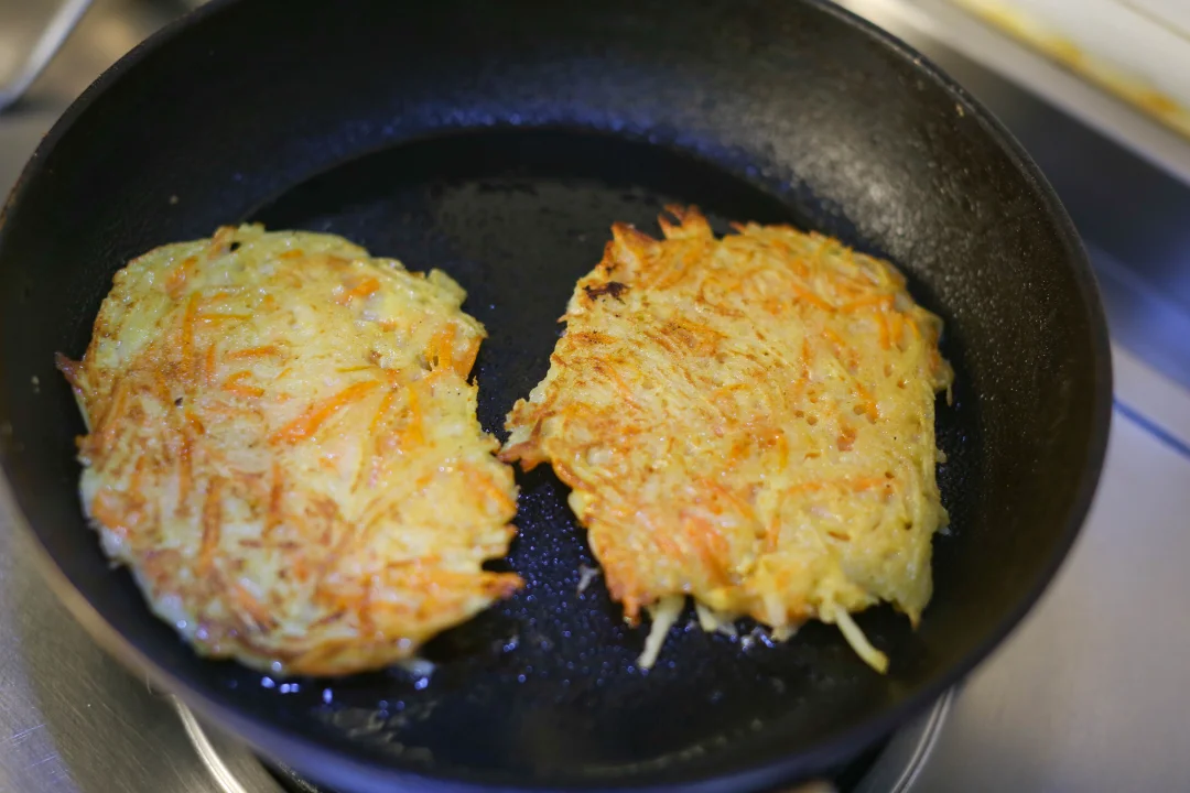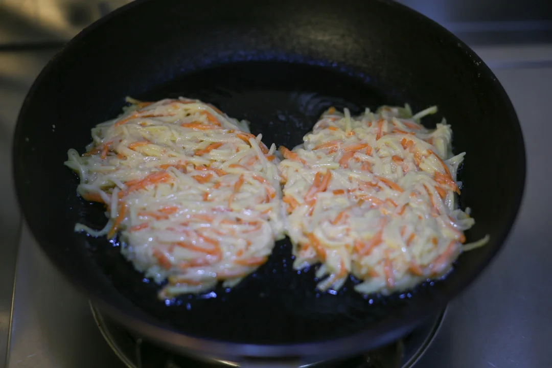 • 7:平底锅中加入适量食用油,把弄好的小饼放进去,中小火慢煎,煎至两面金黄即可。