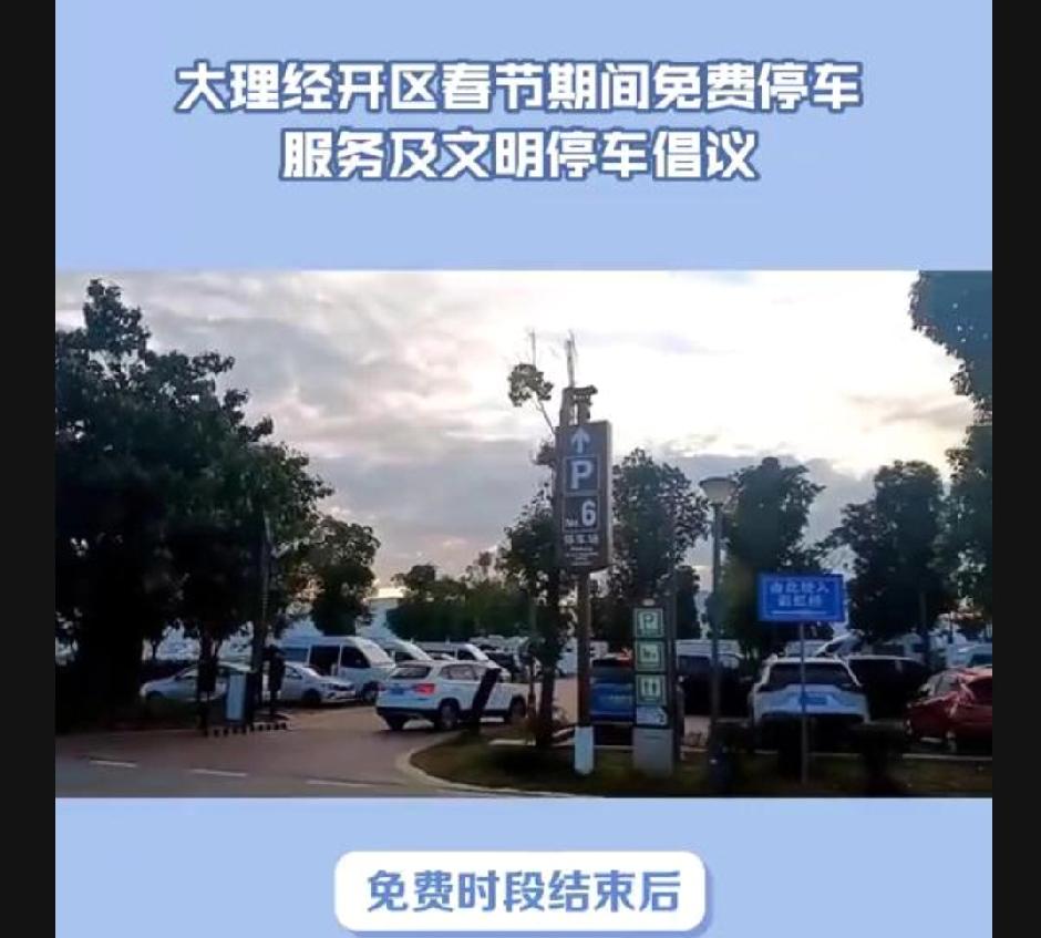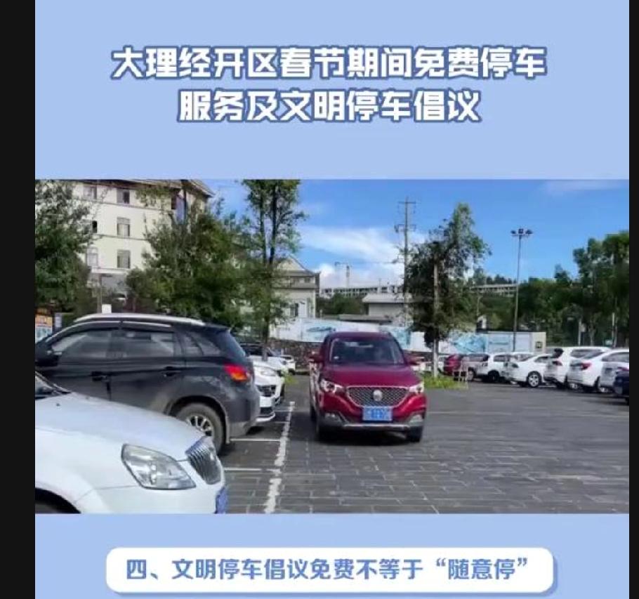 大理经开区春节期间免费停车服务及文明停车倡议。 大理经开区路侧公共停车位及部分停车场春节期间免费开放,致广大司机朋友的一封信。 亲爱的司机朋友们,新春佳节将至,苍山洱海迎客来,风花雪月待君游。为营造安全、有序、便捷的旅游环境,切实缓解春节假期"停车难"问题,2026年春节期间,大理经开区路侧公共停车位及部分停车场实行免费开放,让每一位司机朋友停得安心、玩得舒心、行得顺心。 ·一、免费停车时间2026年2月15日上午8:00起至2月23日晚上20:00止,共计9天。 ·二、免费范围大理经济技术开发区范围内进行停车收费管理的全部路段,以及黄瓜营口袋公园停车场、天井村口袋公园停车场、夏尔阳口袋公园停车场、海涵口袋公园停车场、育才三小地下停车场,共计5个停车场。 ·三、温馨提示本次免费仅限政府施划的大理经开区路侧公共停车位及部分停车场,不包含商场、酒店、私人停车场及封闭式收费停车场。 ·四、文明停车倡议免费不等于"随意停",为保障道路畅通与游客安全,请您务必做到按位停放,车辆停人标线内不压线、不跨位,方向一致,按道路行驶方向顺向停车,留出通道,不在消防通道、公交站交叉路口50米内停车。爱护环境,不乱扔垃圾,不破坏绿化设施,服从引导,听从现场交警指挥,高峰期耐心等候。 ·五、特别提醒春节期间大理游客量大,建议错峰出行,免费时段结束后将恢复正常收费。请留意现场告示牌,停车期间请锁好车门车窗,妥善保管车内贵重物品。免费停车时段内车辆及车内物品的安全由车主自行承担。如遇停车相关问题,请拨打大理州信息产业投资有限公司服务热线:19388516232、19143254502。 风花雪月地,四季好风光。大理不仅以美景相邀,更以诚意相待。这个春节让我们在苍山雪影下团圆,在洱海清波旁欢聚。祝您一路平安、新春快乐、旅途愉快! 大理州信息产业投资有限公司2026年2月13日。临时停车免费 免费停车点 对外免费停车 免费汽车停车点 大理路边停车费 免费停车好去处 大理 免费