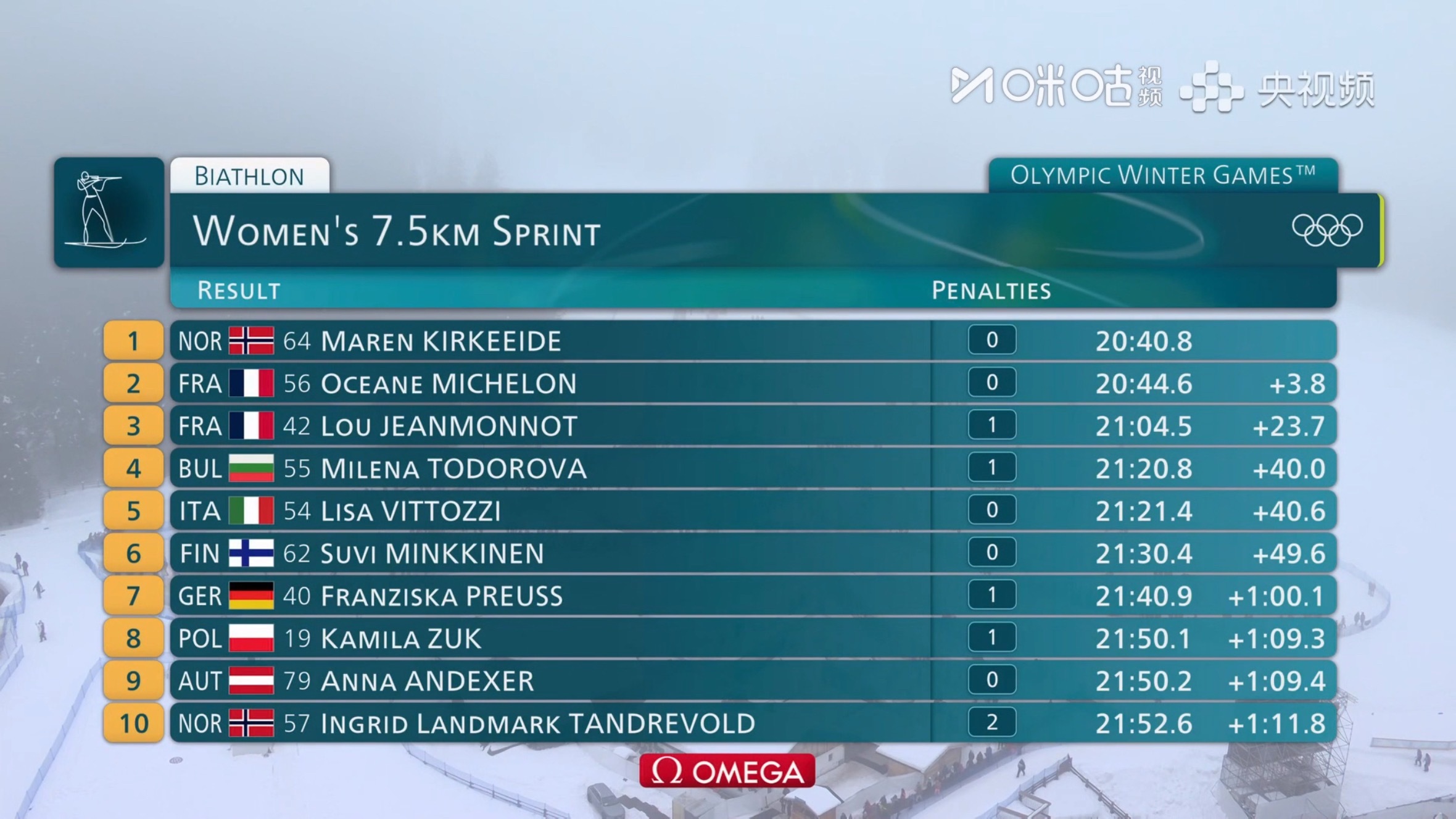 米兰冬奥会冬季两项女子7.5公里短距离赛结束,挪威选手20:40.8夺得金牌,中国选手褚源蒙22:32.7排名第31,孟繁棋22:59.8排名第48位。