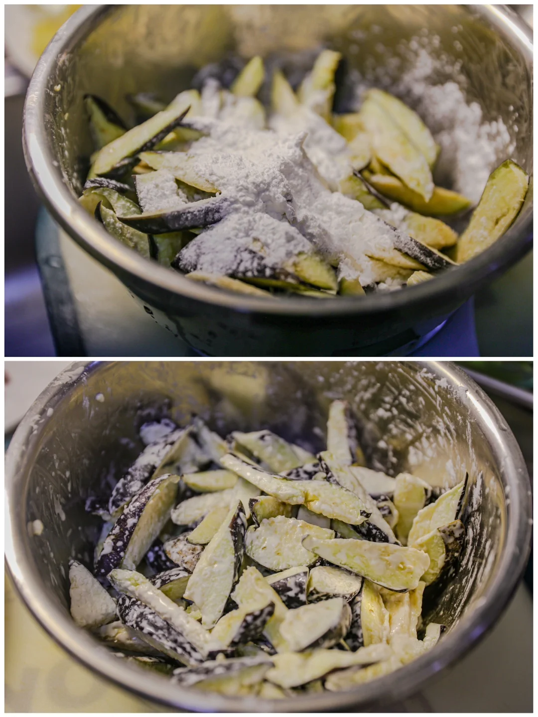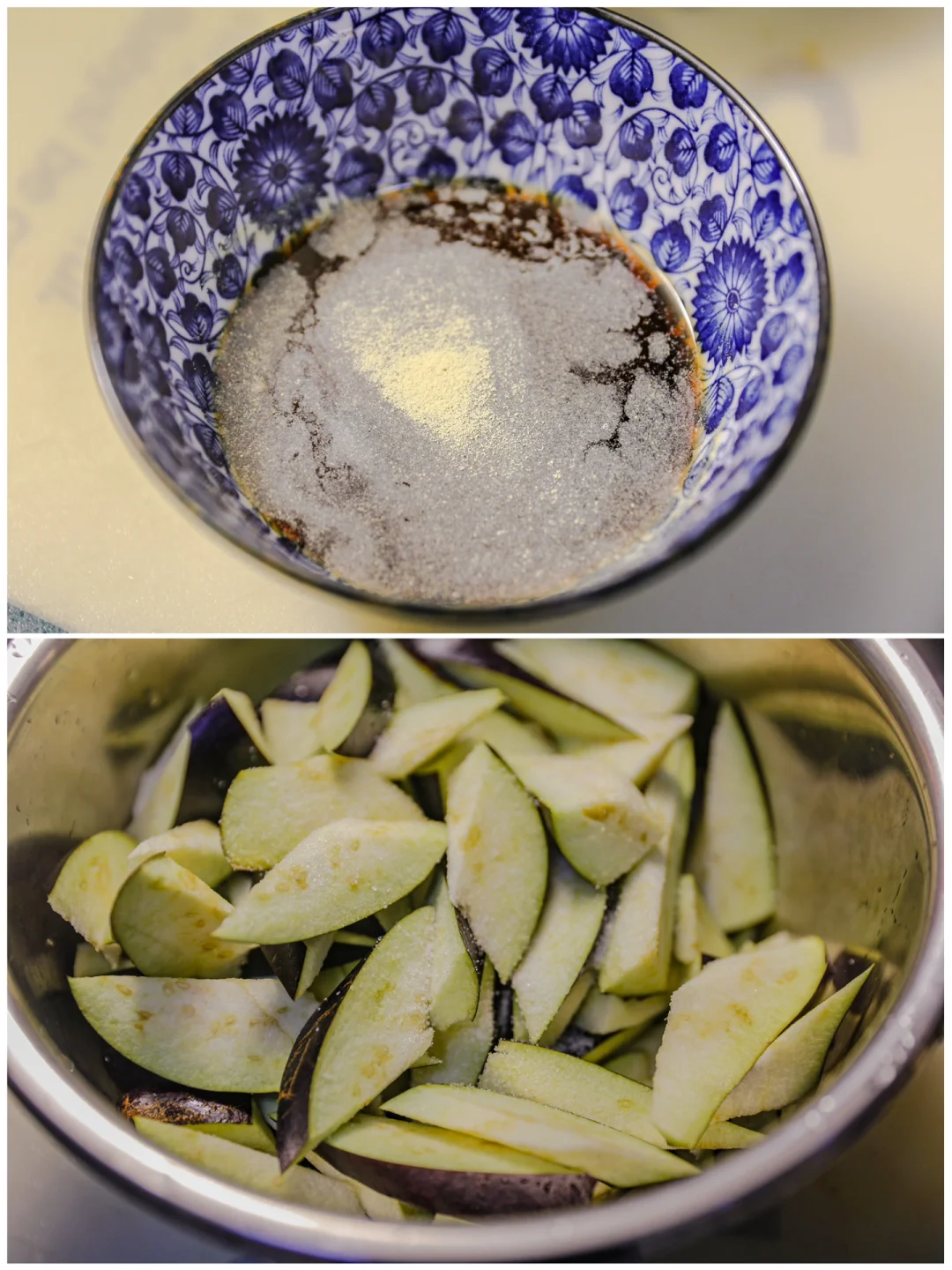 1.长茄子清洗干净之后,一分为二,斜切成长条状。在茄子条中加入食盐,抓拌均匀,放入部分玉米淀粉拌匀,在加入剩下的玉米淀粉,让每一根茄子条都均匀裹上玉米淀粉。