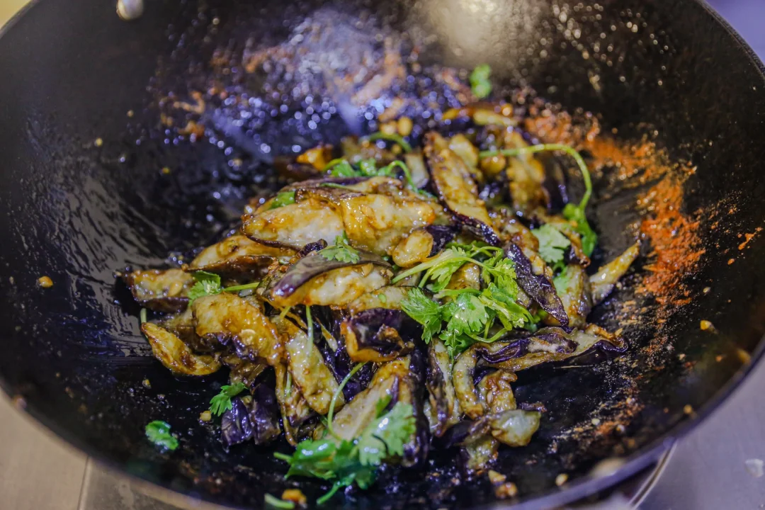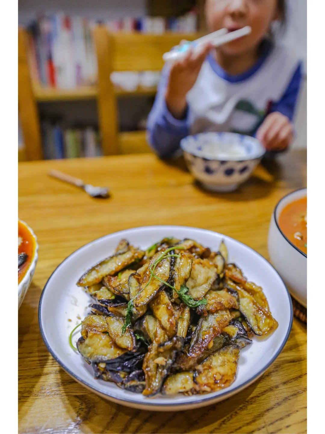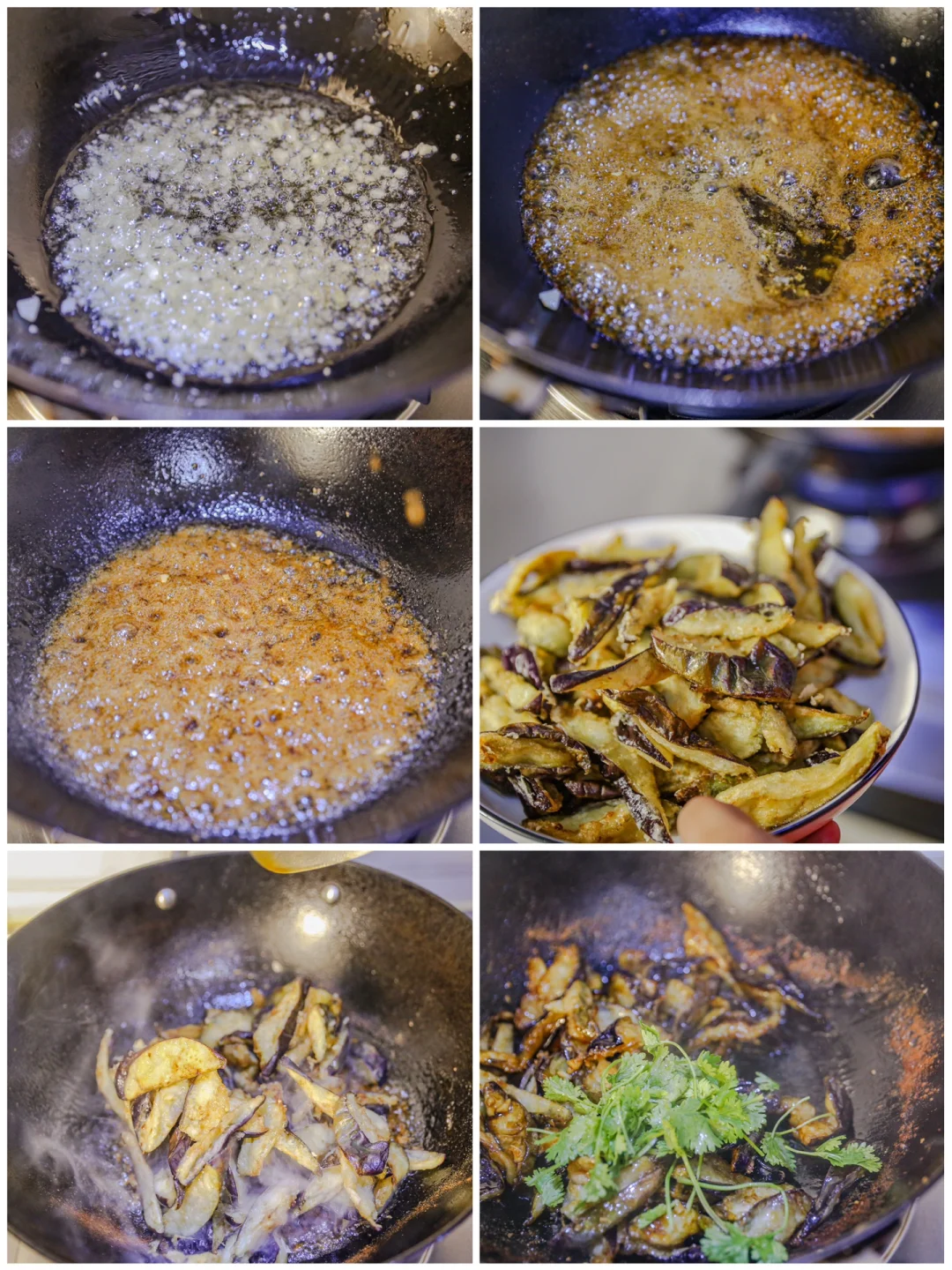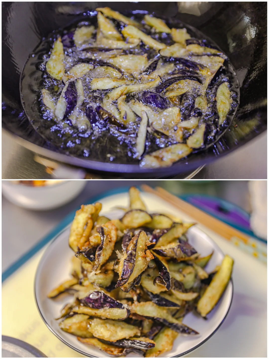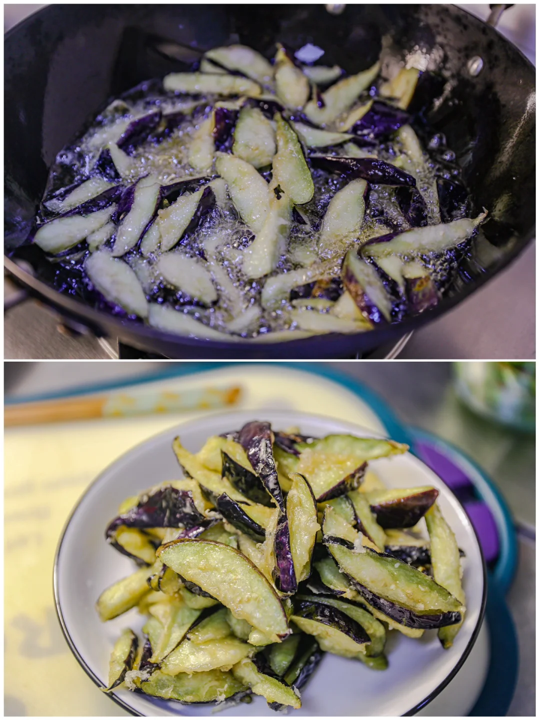 2.起锅烧油,待油温稍微升高的时候加入茄子条,炸定型捞出。油温继续加热成七成热,再次放入茄子条,复炸至茄子条呈或红色,捞出控油。