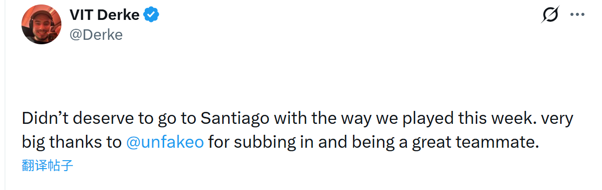 这周我们打得这么差,确实不配去圣地亚哥大师赛。非常感谢unfake的替补上场,他真的是个很棒的队友。"