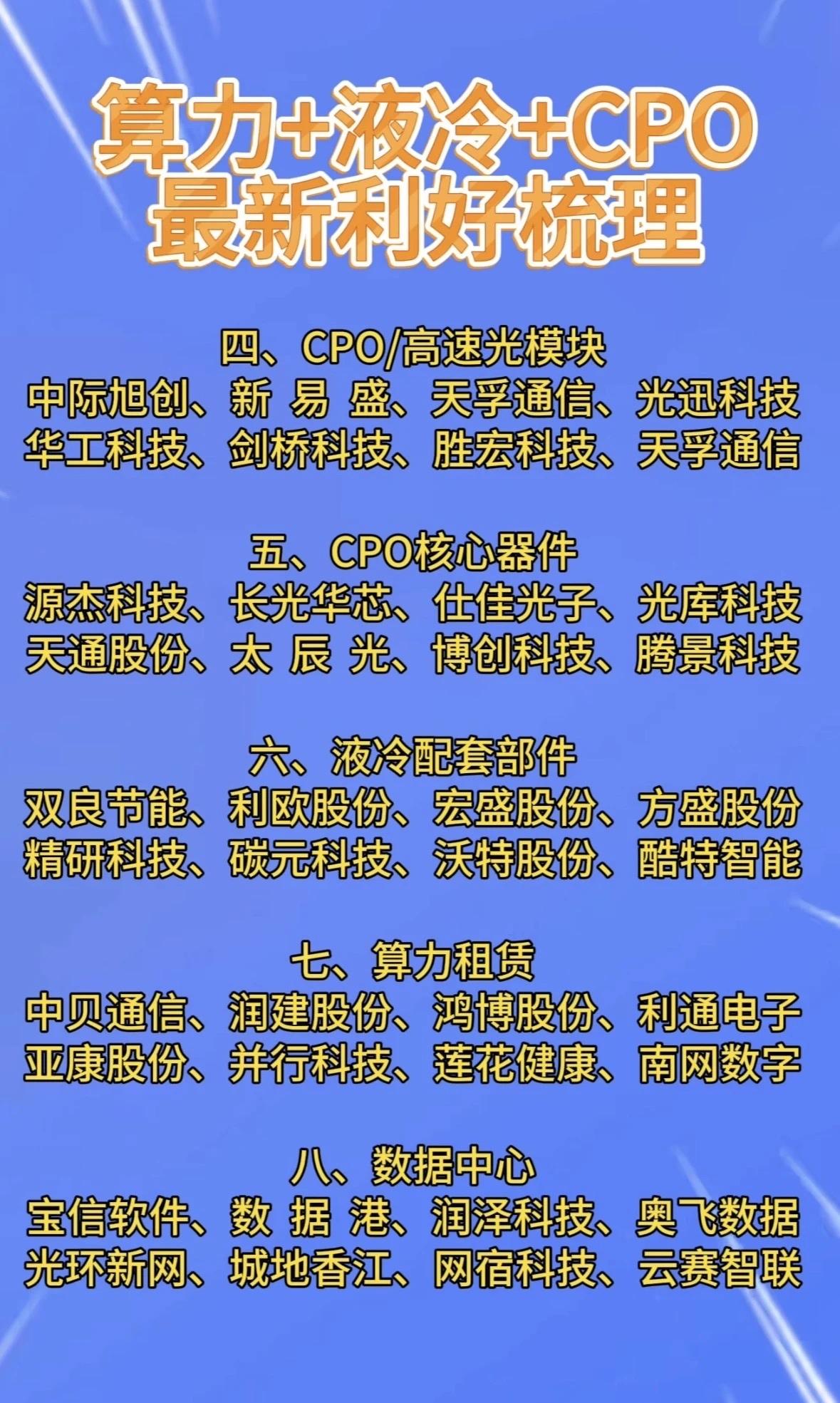 围绕“算力+液冷+CPO”主题,梳理最新利好:智谱GLM-5适配国产芯片、阿里千问APP流量爆崩、工信部算力互联互通节点建设加速、英伟达液冷供应商订单暴增252%等因素,推动三大赛道迎政策+需求+业绩三重催化,核心爆发点为算力硬件、液冷散热、高速互联。 并分板块列出相关企业: 1. 算力芯片:海光信息、寒武纪等; 2. 液冷服务器整机:浪潮信息、中科曙光等; 3. 液冷温控系统:英维克、高澜股份等; 4. CPO/高速光模块:中际旭创、新易盛等; 5. CPO核心器件:源杰科技、长光华芯等; 6. 液冷配套部件:双良节能、利欧股份等; 7. 算力租赁:中贝通信、润建股份等; 8. 数据中心:宝信软件、数据港等。