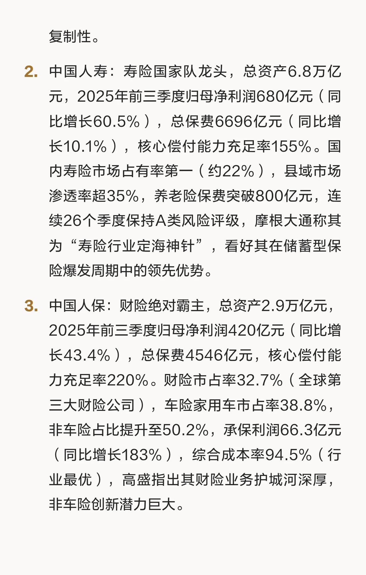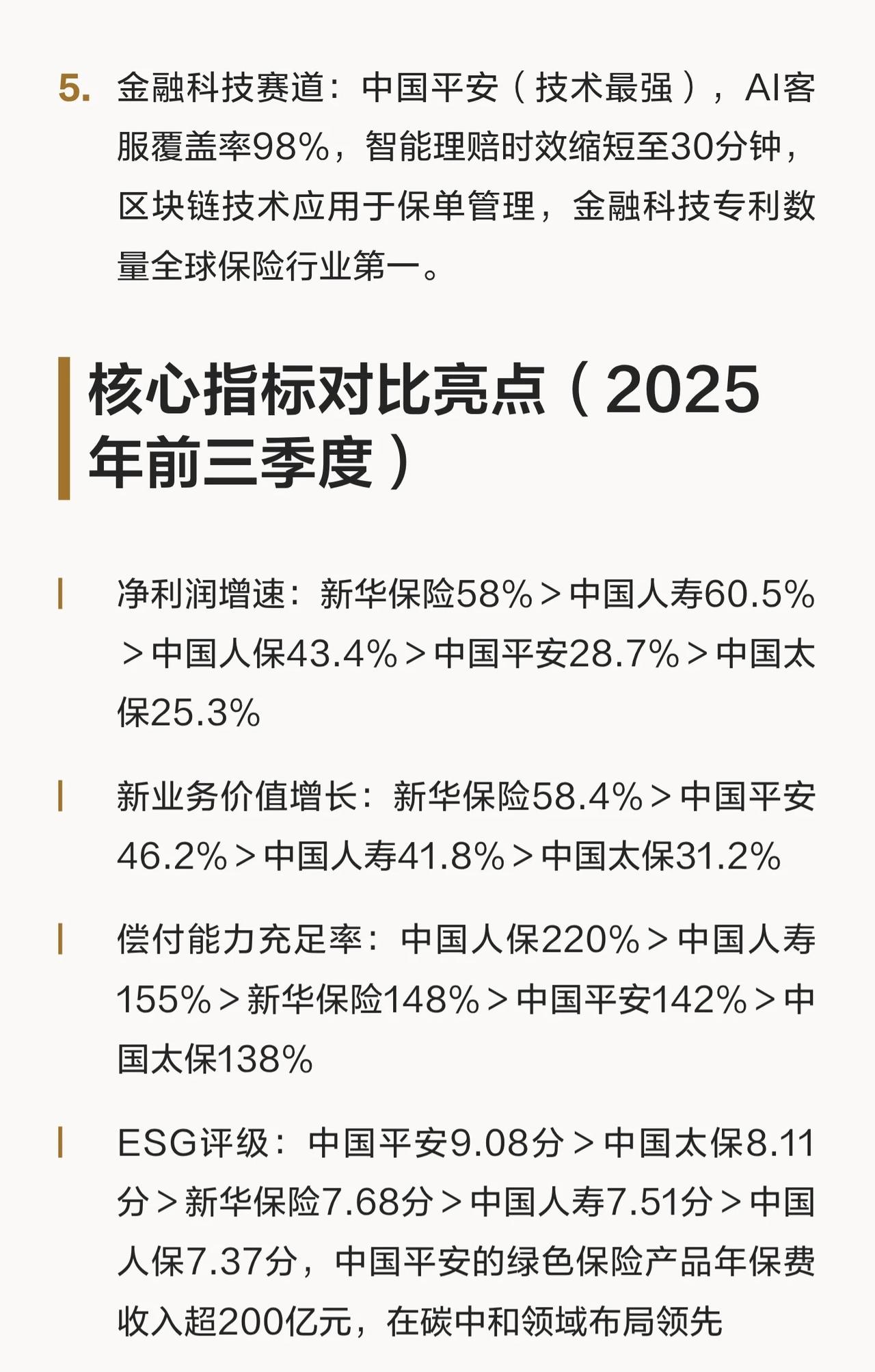 A股保险实力排行榜,从综合实力、细分赛道和核心指标三个维度对五家头部保险公司进行对比分析。 - 综合实力 TOP5:1️⃣ 中国平安 — 综合金融绝对龙头,总资产超10万亿,2025年前三季度净利润837亿,保费7200亿+,核心偿付率142%,风险评级AAA,全牌照+科技领先。2️⃣ 中国人寿 — 寿险国家队龙头,总资产6.8万亿,净利润680亿(同比+60.5%),保费6696亿,核心偿付率155%,寿险市占率22%。3️⃣ 中国人保 — 财险霸主,总资产2.9万亿,净利润420亿(同比+43.4%),保费4546亿,核心偿付率220%,财险市占率32.7%。4️⃣ 中国太保 — 均衡发展,总资产3.1万亿,净利润457亿,寿险+财险均衡,“大健康+大养老”生态领先。5️⃣ 新华保险 — 高成长寿险,总资产1.2万亿,净利润185亿(同比+58%),新业务价值增长58.4%居首。 - 细分赛道冠军: - 综合金融:中国平安 - 寿险规模:中国人寿 / 增速:新华保险 - 财险:中国人保 - 养老生态:中国太保 - 金融科技:中国平安 - 核心指标(2025前三季度): - 净利润增速:新华 58% > 国寿 60.5% > 人保 43.4% > 平安 28.7% > 太保 25.3% - 新业务价值增长:新华 58.4% > 平安 46.2% > 国寿 41.8% > 太保 31.2% - 偿付能力充足率:人保 220% > 国寿 155% > 新华 148% > 平安 142% > 太保 138% - ESG评级:平安 9.08 > 太保 8.11 > 新华 7.68 > 国寿 7.51 > 人保 7.37 整体来看,中国平安在综合金融、科技、ESG方面全面领先;中国人寿寿险规模优势明显;中国人保财险与偿付能力最强;中国太保在养老生态布局领先;新华保险则是高成长、创新驱动的代表。
