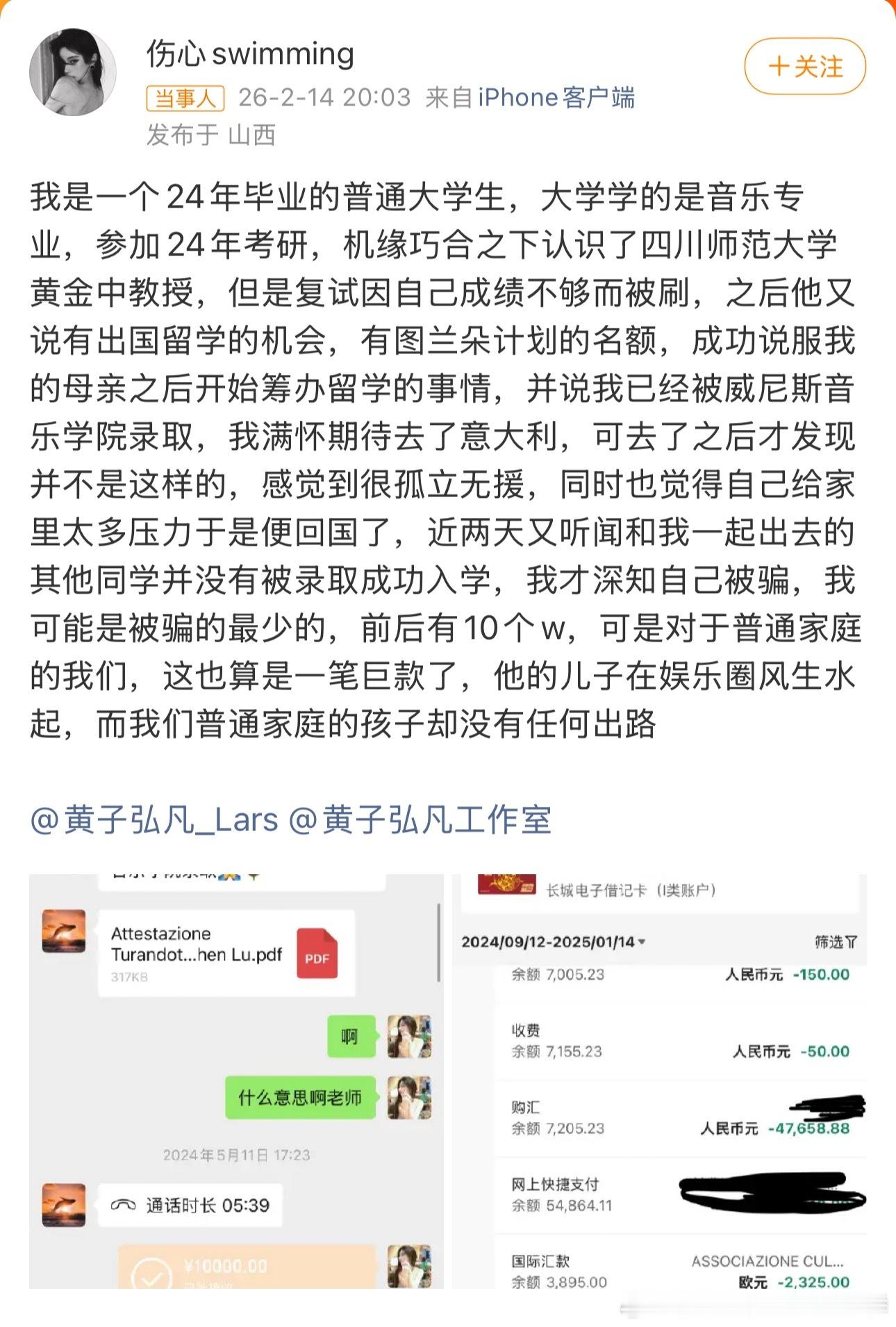 爆黄子弘凡爸爸诈骗学生 首先说明我的看法:不相信 有几个点:1.首先真的被骗了为什么不去报警而是在这里发微博2.怎么证明对方是黄子弘凡的爸爸黄金中教授,仅凭一个微软名吗?3.说是他给你说的有留学机会,那么聊天不可能一点都没有提及 4.留学怎么可能只需要10w左右5.说是音乐专业毕业的,那么本科毕业证书,录取通知书,或者其他相关证书都没有看见,不可能本科都毕业了什么都没有吧,在这如果有,你能证明那是你本人的吗?什么都没看到,只有两张无凭无据的截图