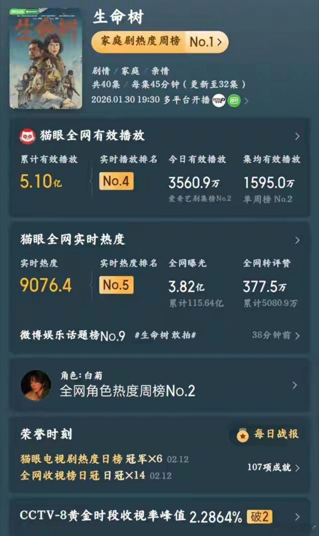 生命树豆瓣开分8.1笔者结合观众的反馈与评分,重新盘点一下剧中8位关键演员的表现。究竟是谁演活了那个时代的无私与罪恶,又是谁能摘得观众心中的“演技桂冠”?第八名,张哲华(饰 邵云飞),6.3分张哲华在剧中的表现,足以让那些质疑他是“资源咖”的人闭嘴。他饰演的邵云飞,是一个初入无人区的记者,也是女主白菊的爱人。这个角色不仅串联起了剧情,更贡献了全剧不少的笑点与泪点。张哲华演出了那种“初生牛犊”的愣劲儿。刚进场时,他眼神清澈得像高原的湖水,对危险一无所知,穿着冲锋衣拦车的模样,活脱脱一个热血过头的愣头青。然而,随着剧情深入,邵云飞见证了盗猎者的残忍,张哲华的处理方式让人惊喜。在那场对着恶人嘶吼“让你家里人看看”的戏里,他面红耳赤、青筋暴起,没有夸张的肢体语言,全靠眼神里的恨意和声音里的颤抖,将角色的愤怒与崩溃传达得淋漓尽致。哪怕是被大舅哥怼得哑口无言、手舞足蹈的窘迫戏份,他也演得憨态可掬。这种自然流露的“嫩”与“真”,让这个角色格外讨喜。第七名,周游(饰 白椿),6.9分周游饰演的白椿,绝对是全剧最有“性张力”的角色。他的长相自带一种野性与阴郁并存的气质,穿上军装挺拔肃杀,眼神里藏着生人勿近的疏离感,却又让人忍不住想探究。周游把“爱而不得”演到了骨子里。白椿对白菊的感情是禁忌且压抑的。当母亲戳破他的心事时,他眼神里的震惊、慌乱与脆弱瞬间击中人心。尤其是重逢时的拥抱,想用力收紧却又不得不克制地收回,这种拉扯感看得人揪心不已。更绝的是他对角色黑化过程的处理。从一开始的阴郁眼神,到后来为了前途逐渐迷失,那种从复员军人堕落为生态罪人的转变,被他演绎得丝滑且合理,让人既恨他的选择,又怜他的身不由己。第六名,杨烁(饰 李永强),7.1分这一次,杨烁用实力狠狠撕掉了“油腻”的标签。在《生命树》里,他饰演的李永强是个彻头彻尾的亡命之徒。造型上,络腮胡、破帽茬、粗糙的皮肤,往那一坐就是一股生人勿近的戾气。杨烁这次的表演极其收敛却又极具爆发力。挟持人质时,他眼神冰冷疯狂;谈判桌上,他嘴角勾起的冷笑透着对生命的蔑视。尤其是最后中枪倒地的戏份,眼神从凶狠涣散至不甘,将一个被贪婪吞噬灵魂的人演活了。放下耍帅包袱、彻底融入角色的杨烁,证明了一个道理:好演员沉下心来,真的会发光。第五名,杨紫(饰 白菊),7.2分作为全剧核心,杨紫饰演的白菊背负着沉重的成长线。从草原孤女到生态守护者,杨紫这次彻底抛开了偶像包袱。素颜、粗糙的造型不仅贴脸,更见证了她在演技上的突破。最震撼的莫过于那场无人区求救的戏。在极度寒冷中,她连滚带爬地扑向光亮,手指死死抠进冻土,嘶哑的呼喊声脖子青筋暴起,那种濒临绝境的求生欲让人看得心惊肉跳。战友牺牲时的哭戏,她也处理得极具层次,从静止的震惊到压抑的崩溃,极具感染力。遗憾的是,部分观众指出她在极度情绪下面部状态稍显僵硬,这在一定程度上影响了情感的完整传递,否则分数本可以更高。第四名,李光洁(饰 林培生),8.1分李光洁不愧是擅长拿捏复杂角色的戏骨。他饰演的林培生,游走在善恶边缘,让人捉摸不透。在多杰尸体被发现的那场戏中,饭桌上的他心神不宁,眼神游离、筷子空扒,将一个“心里有鬼”的人演得入木三分。不用大吼大叫,仅靠微表情和小动作,他就立住了一个深藏秘密、在黑白间挣扎的人物形象。这种让人猜不透的张力,正是演技的功力所在。第三名,梅婷(饰 张勤勤),8.2分年代剧女王梅婷,再次展现了何为“稳”。无论是《太平年》里的大家长,还是《生命树》里飒爽的医生张勤勤,她都信手拈来。剧中,她身穿白大褂眼神悲悯,骑马持枪英姿飒爽,将女性的柔韧与母性的包容完美融合。她看穿儿子秘密时的隐忍,面对荒原守护时的果决,都演得从容不迫。这种润物细无声的演技,才是最见功底的。第二名,袁弘(饰 孟耀辉),8.6分袁弘演的孟耀辉,大概是全剧最让人“头大”的角色,因为根本猜不透他是正是邪。上一秒还是沙漠里眼神阴狠的狙击手,下一秒就变成了真诚坦荡的过路人。吃白馍馍时的怀念与欣喜,让人忍不住猜测他与多杰的渊源;可回想起他持枪的狠戾,又让人不寒而栗。袁弘将这种“伪装感”拿捏得滴水不漏,好人的真诚与坏人的凶残在他身上无缝切换,这种极具悬念感的表演,让人不得不服。第一名,胡歌(饰 多杰),9.5分第一名毫无争议,胡歌用实力诠释了何为“人戏合一”。如果说梅长苏是他的巅峰,那么多杰则是他演艺生涯的又一座丰碑。在这部剧里,你看不到胡歌的影子,只能看到那个在可可西里风沙中坚守的巡山队长。最让人起鸡皮疙瘩的,是他将石块贴在脸上悼念女儿的一幕。没有撕心裂肺,只有静谧的悲伤与神性的悲悯,那一刻他仿佛化身成了这片土地的守护神。与反派谈判时,他嘴角微小的抽动、下颌线的绷紧,将震怒与隐忍传达得精准无比;找到徒弟尸体时的哭戏,眼红无声、泪落如珠,每一滴眼泪都砸在观众心上。胡歌不仅演出了多杰的骨血,更演出了他的灵魂,这个第一名,实至名归。