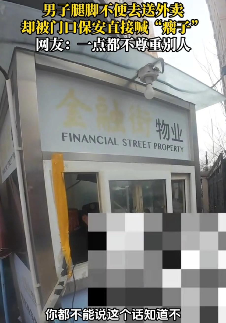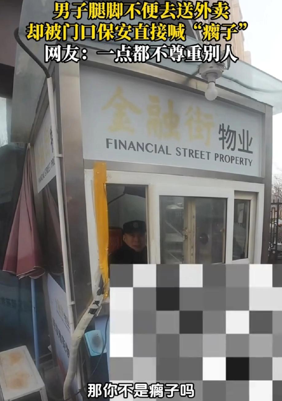 这种没素质的保安,就应该开除! 男子腿脚不便去送外卖,却被门口保安直接喊“瘸子”,男子压住心中怒火让保安下次说话不要那么难听。结果保安还理直气壮问“那你不是瘸子吗?” 打人不打脸,骂人不揭短,这是做人最基本的教养和底线。男子是腿部有残疾,走路一瘸一拐的,但是保安也不能这么喊。这是在男子伤口上撒盐,在男子心头上扎刀,一点素质都没有。 同样是劳动人民,都是社会底层人士,穷人何必为难穷人!男子从头到尾都是劝诫保安说话不要那么难听,对比保安张口“瘸子”闭口“瘸子”,这素质,修养不止一点。 建议男子保留视频,投诉物业,让他们开除保安。这种没素质的人,就不适合做保安,如果继续任用,只会给公司丢人,影响公司声誉。
