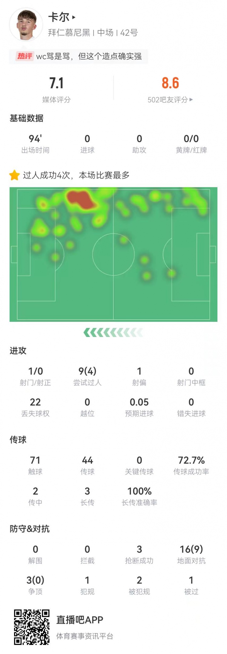 直播吧2月15日讯拜仁在本轮德甲3-0完胜不莱梅,卡尔本场数据如下: