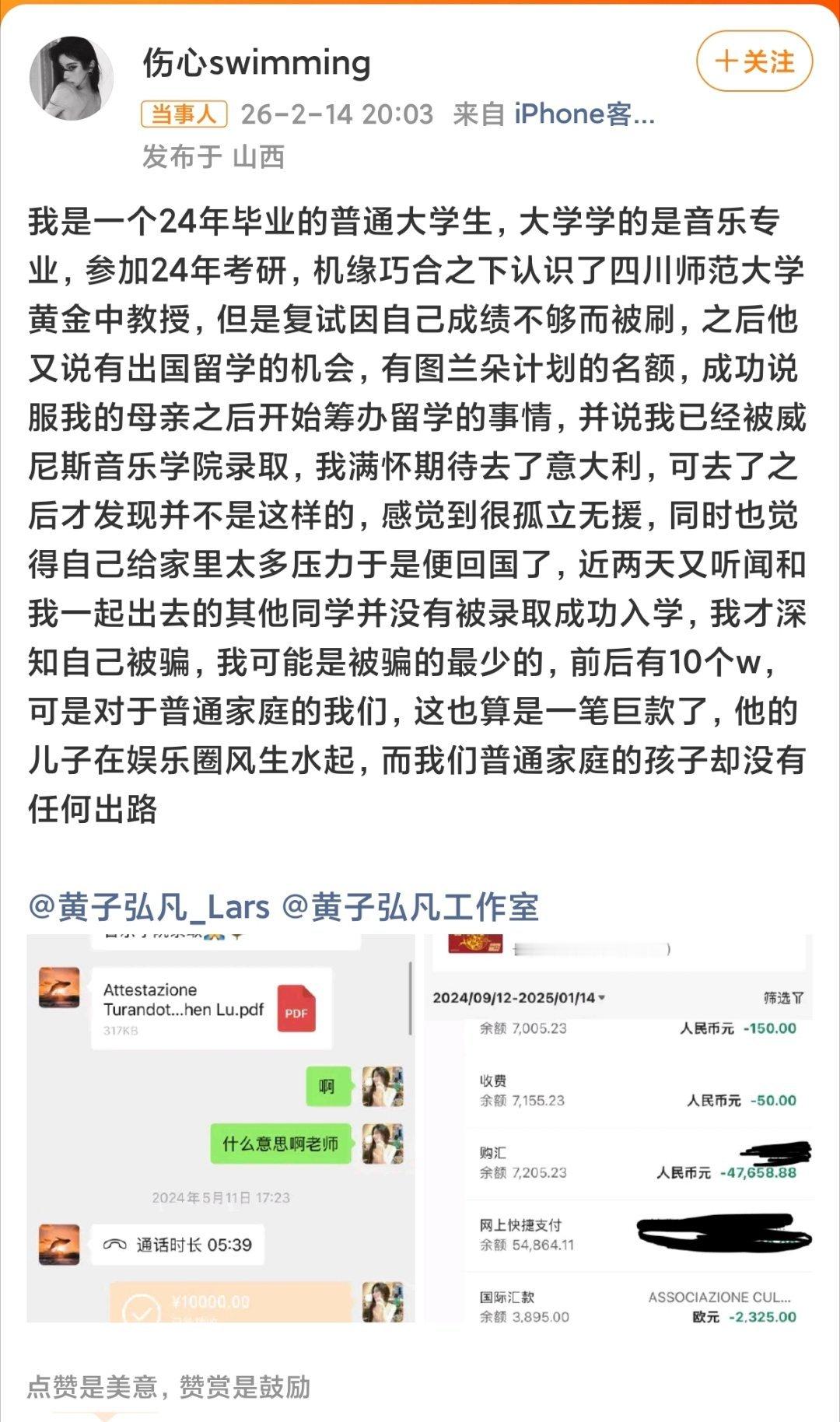 曝黄子弘凡爸爸诈骗学生曝黄子弘凡爸爸诈骗学生 黄子弘凡爸爸诈骗就是说这瓜吃得我一整个愣住了!刚刷到黄子弘凡他爸黄金中被曝诈骗学生10万,说是保录威尼斯音乐学院,结果人去了意大利才发现根本没录取,还有好几个学生踩了同个坑,这事儿也太离谱了吧?先说说黄金中这身份,川师大音乐学院教授、博导,还顶着“西部歌王”的头衔,看着德高望重的样子,谁能想到能干出这种事?利用考研落榜生想升学的急切心情,拿“图兰朵计划内部名额”当幌子收钱,这不是明晃晃的割韭菜吗?普通家庭攒10万容易吗?就这么被忽悠了,换谁都得崩溃。然后就是黄子弘凡这边,最近刚官宣鸟巢演唱会,营销一直打“音乐世家”“根正苗红”的牌,现在出了这档子事,很难不被牵连啊。虽然说法理上父债子还不成立,但要是真如爆料所说,诈骗来的钱贴补了儿子的演艺事业,那这事儿性质可就完全变了。不过咱也得理性点,现在只有网友的爆料和转账、通话记录这些证据,没有正式的合同和录取通知,也有人质疑是“蹭热度”,毕竟赶在黄子弘凡演唱会宣传期爆料,时间点确实有点巧。但受害者说维权被压,不是走投无路谁会顶着压力上网曝光啊?现在最关键的就是川师大和黄子弘凡工作室的回应,截止到现在两边都没出声,这才是最让人抓心挠肝的。希望学校能赶紧核查黄金中的任职状态和这件事的真实性,黄子弘凡那边也别装哑巴,不管知情不知情,给个态度总该有吧?总之,咱先别站队,等官方调查结果和法律程序推进。但如果诈骗属实,黄金中就算是教授也不能逃过制裁,受害者的钱必须追回来!也希望各位想走留学捷径的同学,别轻信什么“内部名额”“保录”,天上不会掉馅饼,正规渠道才是硬道理!