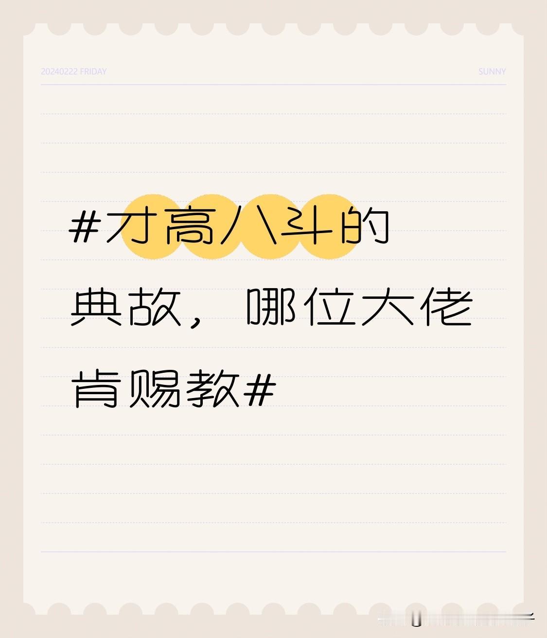 “才高八斗”这个典故和曹植有关。南北朝时,诗人谢灵运恃才傲物,曾说“天下才共一石,曹子建独得八斗,我得一斗,自古及今共用一斗”。这里的曹子建就是曹植。 曹植年少时就才华惊人,10岁登台作《登台赋》,一气呵成。邺下时期,他与文人宴饮游乐,写下诸多宴游诗。后来虽生活苦闷,却在文学创作上达巅峰,像《洛神赋》《赠白马王彪》等都是传世名篇。 后来,“才高八斗”就用来比喻某人才学极高。不得不说,曹植担得起这“八斗”之才。