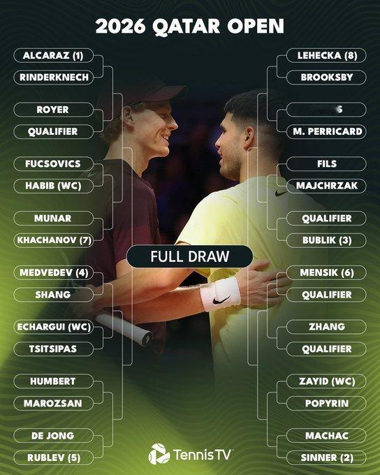 ATP500多哈签表 星光熠熠。 (P)商骏程vs(4)梅总 (P)张之臻vs资格赛选手 小商迎来大考验。 另外: (1)阿卡拉斯vs林德克内希 (2)辛纳vs马哈奇