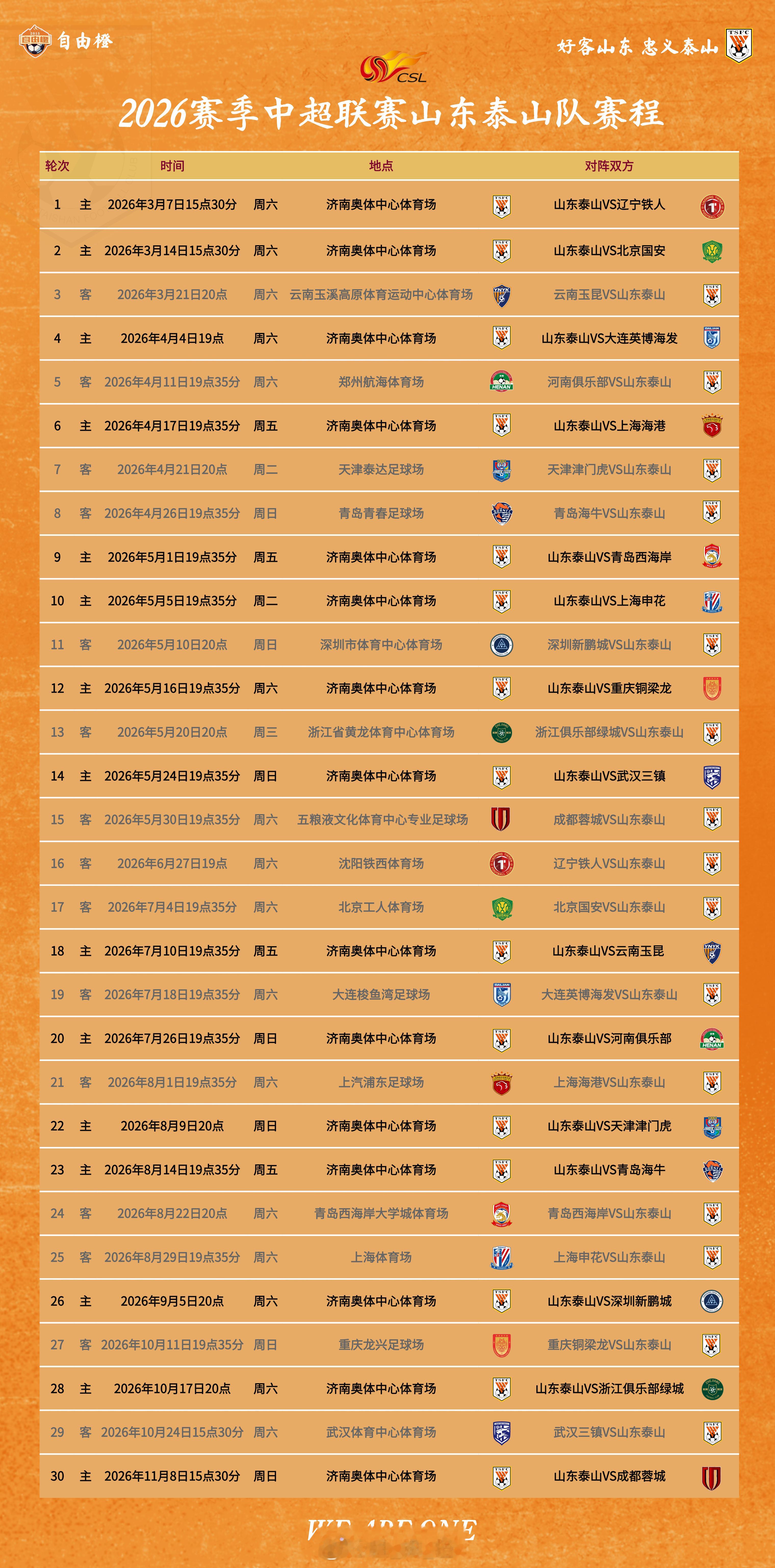 【比赛日,送球衣!】2026赛季,本微博将免费送出三件官方正品球衣;以及继续每场比赛免费送出五件自由橙定制版橙色球衣!欢迎转发!规则:关注本微博++艾特3位好友,3月1日将通过 抽取三件官方正品球衣;后续每场比赛当天(中超、足协杯、所有比赛)抽取五件自由橙定制版橙色球衣!别忘了写出你对泰山队本赛季的祝福期许哦! 自由橙山东泰山